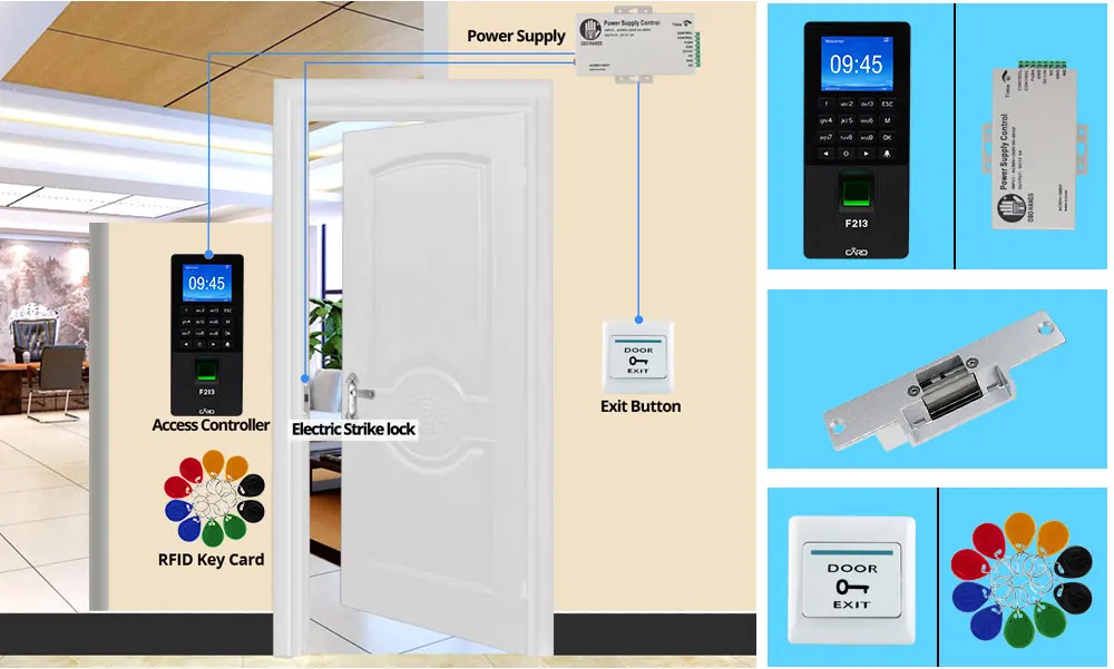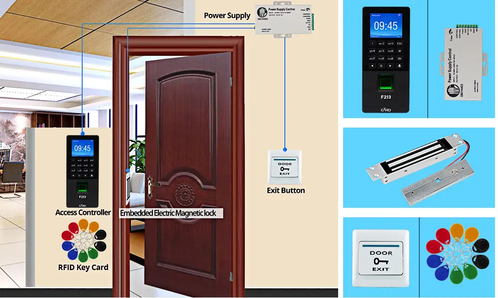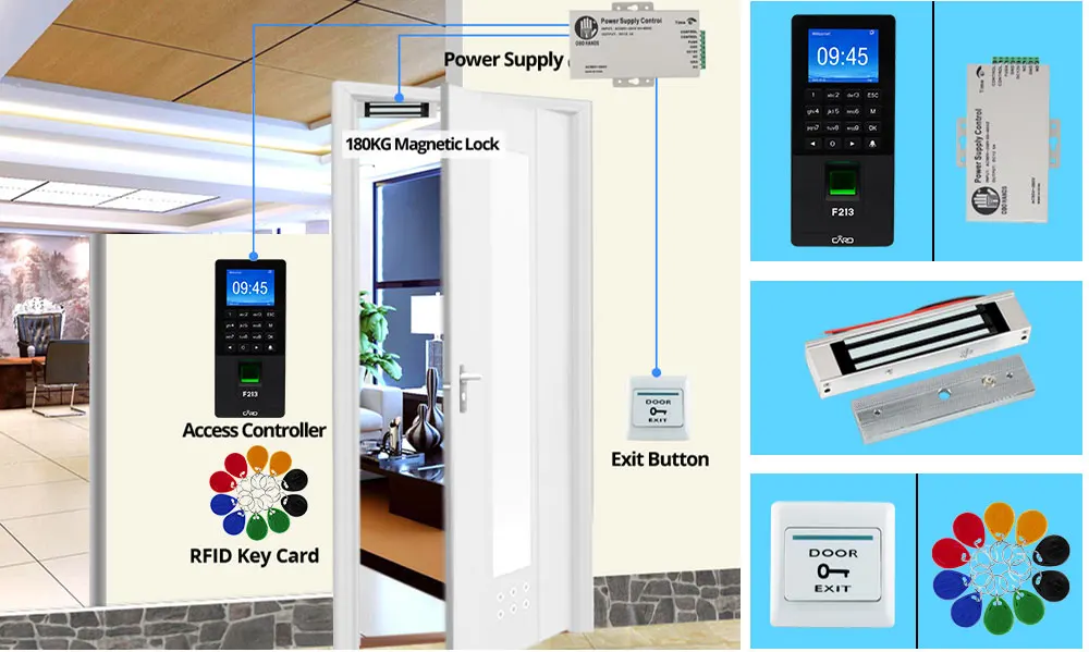 Kit5: Suitable for wooden, metal and glass frame door. No need bracket.Package including: Access Control keypad + Power supply + 180KG Electric Magnetic Lock + Exit button + 10pcs Keyfobs