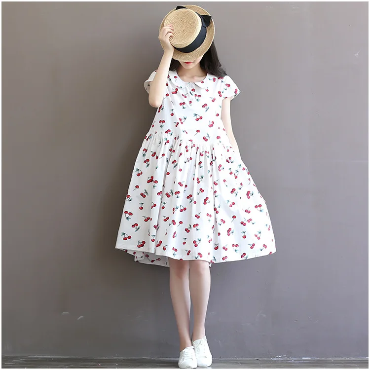 Лето 2020, новинка, большие размеры, женское милое платье в стиле Mori Girl, вишневый принт, хлопок, короткий рукав, кукольный воротник, свободное Повседневное платье DA792