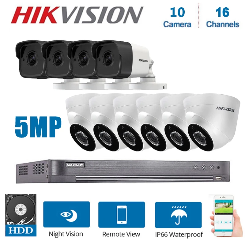 1 * DS-7216HUHI-K2 16-канальный видеорегистратор (Который может поддерживать Макс 16 шт 5 Мп камеры) 6*5 Мп Hikvision внутренние купольные камеры 4*5 Мп Hikvision наружная цилиндрическая камера Адаптер питания 10*12 В 1 * HDD под заказ
