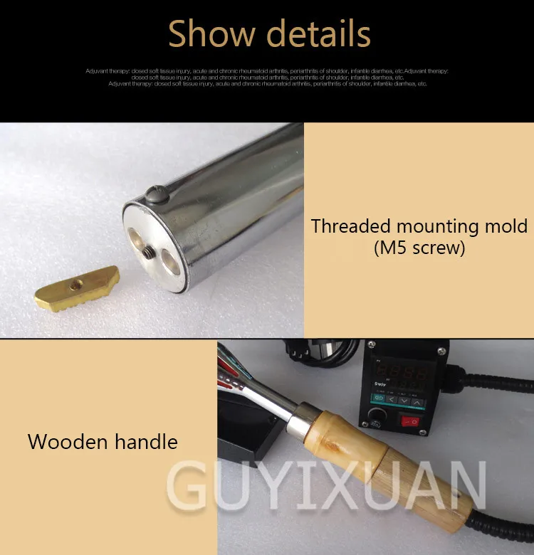 Название продукта: ручная машина для брендинга (бронзовая машина) Напряжение: 220 В/110 В (пожалуйста, свяжитесь со службой поддержки клиентов для настройки) Мощность: 300 Вт Диапазон температур: 0-400 ℃ Площадь нагрева: ≤ 7*7 см Вес нетто: около 1,5 кг (ручка около 0,5 кг) Применимые материалы: продукты питания, кожа, пластик, ПУ, бумага, дерево, стелька, кожура, крафт-бумага и т. Д. Область применения: импринтинг, бронзирование Интерфейс настройки температуры: Клавиша «Set» для установки (подтверждения) температуры Кнопка «<» для выбора одиночных цифр температуры Ключ «∧∧» для выбора значения температуры "PV" показывает фактическую температуру "SV" показывает установленную температуру Инструкции: 1. Установите пресс-форму на машину и зафиксируйте ее с помощью винтов. Это нормально в первый раз, чтобы курить, так что не волнуйтесь. 2. Подключите, чтобы установить температуру, подождите 5-10 минут и подождите, пока значение контроля температуры покажет, что установленная температура была достигнута, а затем проверьте давление на материал. 3. После завершения брендинга машина может быть помещена в безопасную зону для естественного охлаждения, демонтирует форму, чтобы очистить остатки поверхности пресс-формы, И убедитесь, что поверхность формы остается для следующего использования. Примечание: Когда продукт используется в первый раз, будет некоторый запах или дым. Это нормальное явление работы нагревательных труб, а не проблема качества продукции. Если вы возражаете, пожалуйста, покупайте с осторожностью. Лучшая площадь штамповки составляет ≤ 4*4 см.