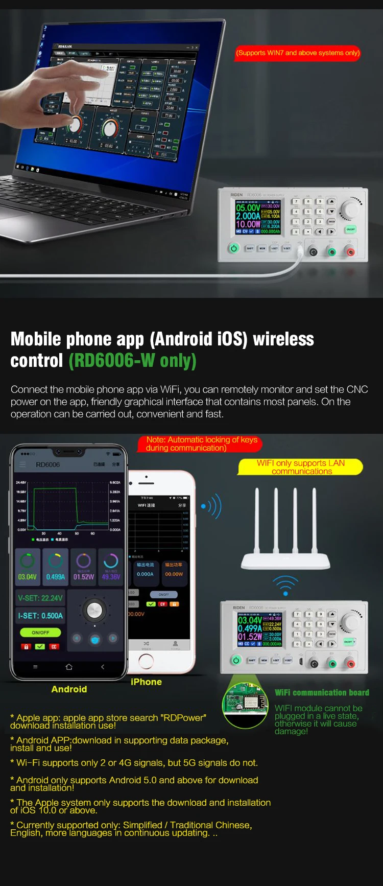 1, RD6006 имеет две версии:RD6006ИRD6006-W, У RD6006-W есть Wi-Fi плата, RD6006 нет. RD6006-W может использовать Wi-Fi плату для подключения приложения и программного обеспечения, а также использовать микро-кабель USB для подключения ПК solftware. RD6006 не имеет Wi-Fi платы, только поддержка программного обеспечения ПК путем подключения с USB микро кабель, без поддержки приложения.