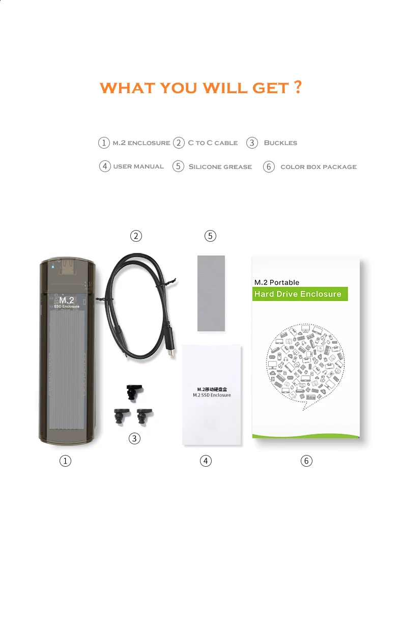 Теплое напоминание 1.M.2 SSD не входит в комплект. 2. Чехол модели NVMe не совместим с NGFF SATA M.2 SSD, наоборот. Спецификация продукта 1. Поддержка M.2 SSD с размером 2230/2242/2260/2280 мм до 2 ТБ. 2.NVME M.2 SSD корпус 10 Гбит/с. 3. Подключи и работай, не требуется драйвер и внешняя мощность для систем Windows/Mac OS/Linux. 4. Прозрачный дизайн из алюминиевого сплава. 5. Модель NVME с двумя типами кабелей C до A(6 Гбит/с) и C до C(10 Гбит/с). 6. Быстрое охлаждение, меньшее повреждение ssd. 7. Светодиодный светильник-индикатор.