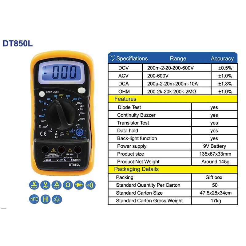 Мультиметр является одним из самых основных навыков в электронике. Это хороший помощник для тестирования и устранения неисправностей, которые существуют в электронном устройстве. Этот цифровой ЖК-мультиметр Вольтметр Омметр Амперметр удовлетворит ваши требования. Благодаря прочному материалу, он достаточно прочный, чтобы его можно было использовать в течение длительного времени. Кроме того, его можно использовать для измерения оставшейся емкости аккумуляторной батареи, чтобы проверить, полностью ли заряжен аккумулятор. С выгодной ценой, этот мультиметр будет вашим лучшим выбором. Не стесняйтесь принести его домой прямо сейчас!