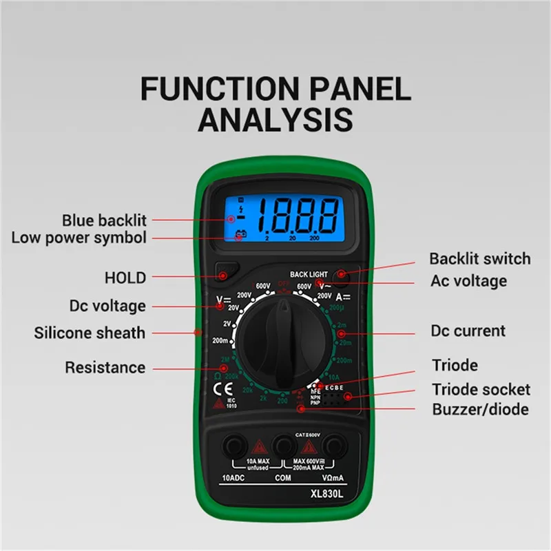2. Точно измеряет-напряжение постоянного тока, напряжение переменного тока, ток постоянного тока, тест транзисторов, диод, Ом и многое другое.