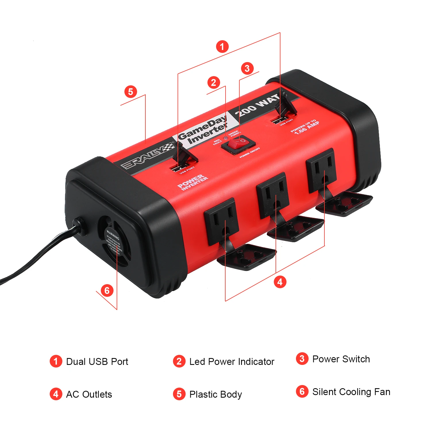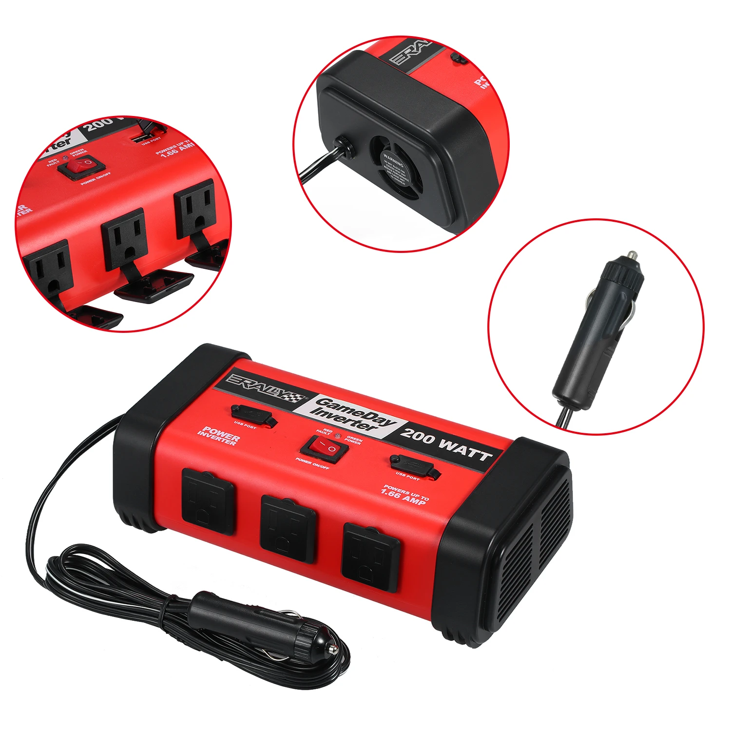 200 Вт инвертор высокой мощности --- поставляется с профессиональной прикуривателем. Обеспечивает 200 ватт непрерывной мощности, преобразует 12 В постоянного тока батареи в стандартный 110 В переменного тока.