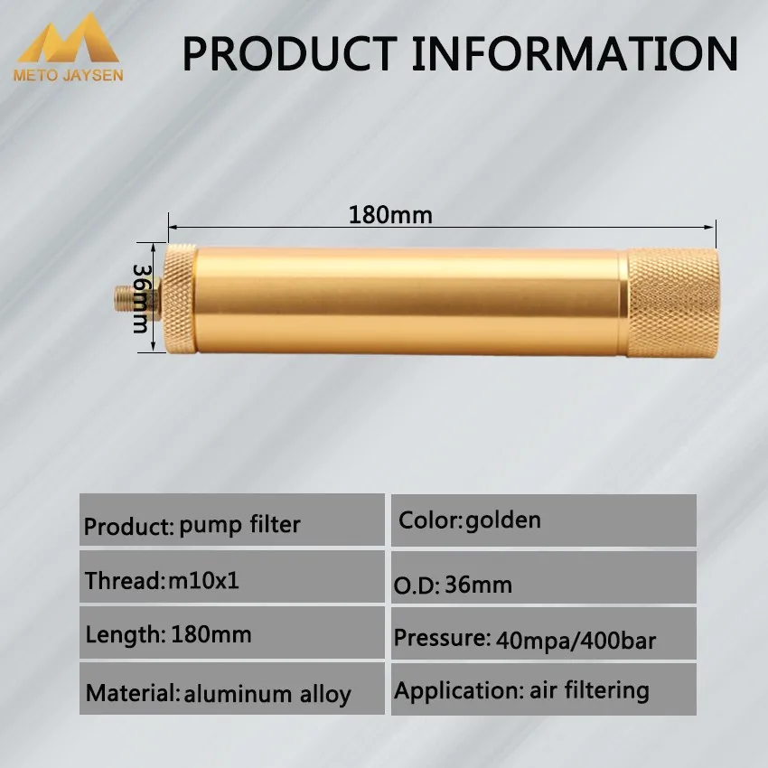Описание продукта: Высококачественный Алюминиевый водно-масляный сепаратор Фильтр насоса высокого давления Это ультра-длинный насоса с фильтром 180 мм в длину Добавьте его в ваш и насос или воздушный компрессор шланг для фильтрации масла, влаги или примесей Давление: 40 МПа/400 бар/6000 фунтов/кв. дюйм Резьба: M10 x 1 Дополнительные фильтрующие элементы включены Бесплатные уплотнительные кольца M10 PTFE и другие запасные уплотнительные кольца будут отправлены вам также Простой и удобный в использовании Идеальные и практичные запасные части для ручного воздушного насоса, PCP, воздушного компрессора и т. Д. Только сепаратор воды-масла, сепаратор воды-масла с быстрым соединителем или сепаратор воды-масла с быстрым соединителем и шлангом доступны для выбора