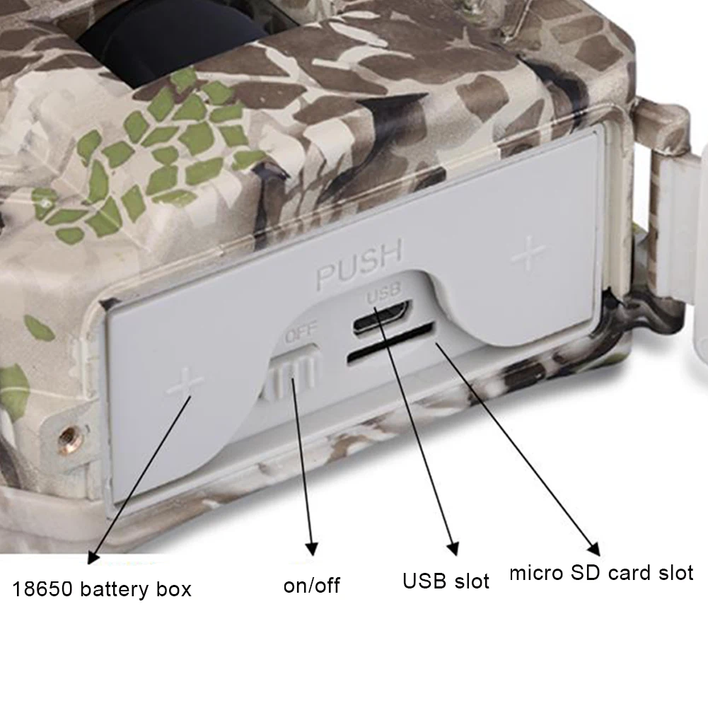 Датчик изображения: 3MP Цвет CMOS Разрешение фото: 12 МП 4032*3024 Разрешение видео: FHD 1920*1080P 25FPS Время срабатывания: 0,8 S Режим работы: 3 фото + 10s видео PIR угол: 110 градусов Объектив: широкий 120 градусов ИК светодиодный: 49 шт. 940нм черный свет Расстояние PIR: 15 м Память: Max Micro SD 32 Гб Разъем USB: 5 контактов USB 2,0 Источник питания: 4 аккумулятора 18650 или 5 в постоянного тока (PR200) Водонепроницаемый: IP56 Время работы: 12 месяцев Ток: 0,01 мА Размер: 125*85*4 мм Вес: 160 г Температура: -10 ~ + 70 ℃/-14 ~ + 158 ℉ Сертификация: CE FCC ROHS Источник питания: камера работает на 4 батареях 18650 или 5 в постоянного тока или 5 В солнечной панели Примечание: рекомендуется удалить батарейки AA при использовании адаптера питания. Подключение USB: когда камера подключена к ПК через usb-кабель, только для чтения файлов данных Когда камера подключена к адаптеру через usb-кабель, только источник питания Установить дату и время: настроить текстовый файл как имя: время, открыть файл timetime.txt», установить дату и время Формат: 2018-03-30 12:59:00, И сохраните его в корне sd-карты. Как начать? A: Откройте батарейный блок и поместите 4 аккумулятора 18650 (PR200) в камеру, как на следующих фотографиях B: вставьте tf-карту в камеру C: установите переключатель в положение «ON», и светильник индикатора будет мигать 1-2 раза, камера войдет в состояние обнаружения PIR. D: он будет делать 3 фотографии и 10s видео запись, когда он обнаружен PIR E: он не будет снимать фото и видео рекордер, когда он не имеет обнаружения PIR, он войдет в режим ожидания или отключится F: имеет функцию перезаписи Упаковочный лист: 1x Охота Камера 1x ремень 1x USB кабель 1x руководство 1xCard читателя Для пульта дистанционного управления 1. Все фотографии являются профессионально цветом, но вследствие различных особенностей цветопередачи на разных окружающей среды светильник и расхождений в настройках экрана устройства настройки, поэтому могут быть некоторые отклонения между фотографии, которые вы видите, и с реальным цветом товара. Пожалуйста, отнеситесь к этому с пониманием. 2. Данные измеряются вручную, могут быть некоторые отклонения, но это не влияет на использование.