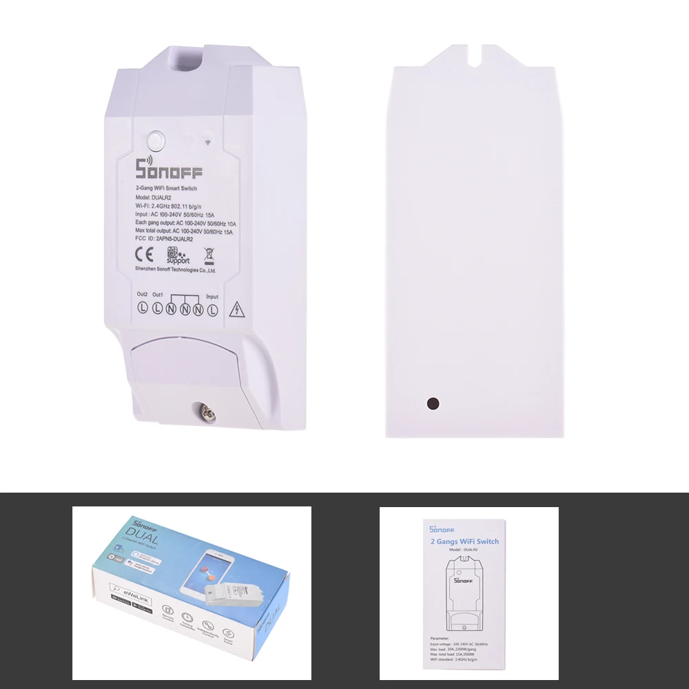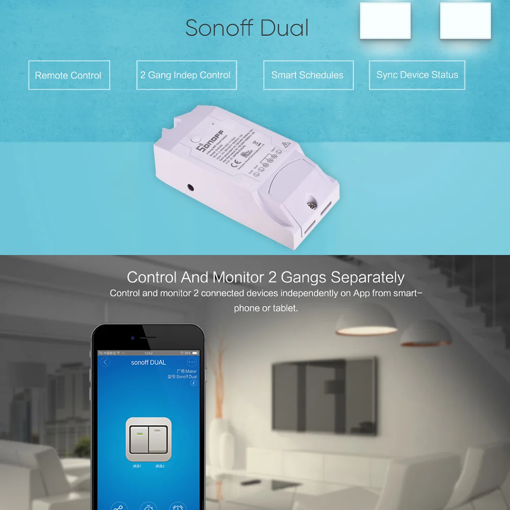Интеллектуальный выключатель света Sonoff Dual-это Wi-Fi на основе 2 gang переключатель, который можно подключить и самостоятельно контролировать два подключенными устройствами или огни, и Он наследует прост в установке и использовании, быстрый Wi-Fi, дистанционное управление через приложение EweLink доступно как на iOS, так и на Android, для самостоятельного включения/выключения каждого из двух подключенных устройств. Но кнопка включения Sonoff Dual 2 банда WiFi светильник не является переключателем включения/выключения, только для сопряжения WiFi. Пользователи могут установить одинарные/повтор/Обратный отсчет времени для включения/выключения в указанное время, а также поделиться с другими, чтобы они могли управлять вместе.