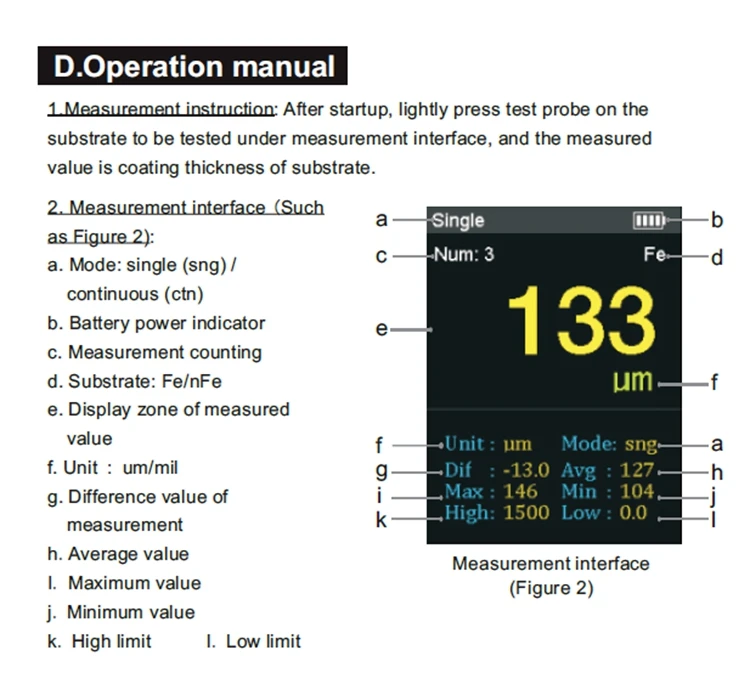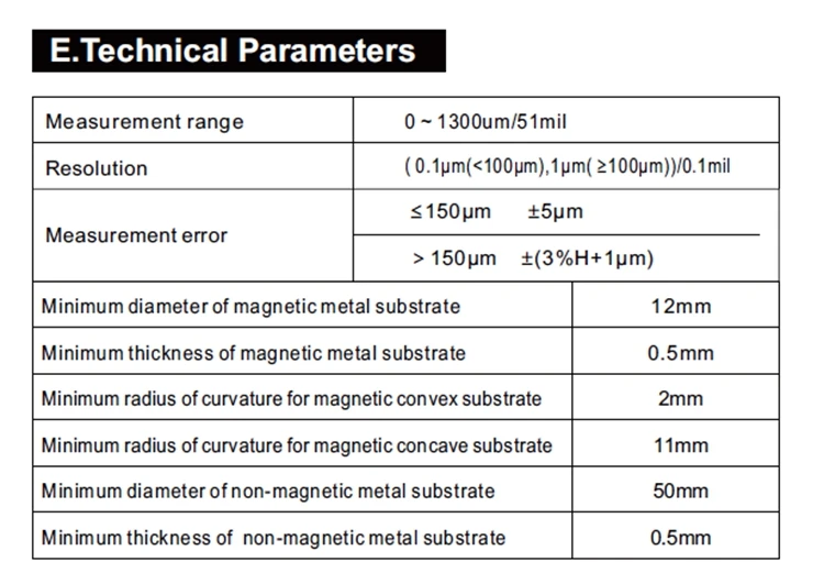 Меню и цветной дисплей HD. Измерение толщины немагнитного покрытия на магнитной поверхности металлической подложки и неметаллического покрытия на немагнитном металле Подложка. Два способа измерения: одно измерение, непрерывное измерение. Базовая калибровка и калибровка нулевой точки доступны. Метрический/имперский блок и функция хранения. Вращение экрана, защита от заряда, отображение нескольких интерфейсов, выбор яркости экрана. Автоматическое отключение.