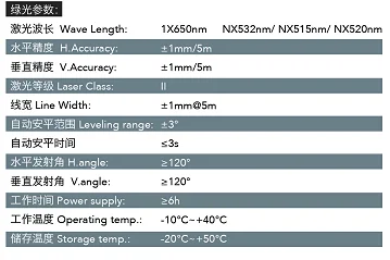 Красные волны Длина 1x65 0 нм/Nx635 GreenWave Длина 1x65 0 нм/Nx523nm/Nx515nm/Nx520 H. Точность ± 1Мм/5m V. Точность ± 1Мм/5m LАсер класс II Линия Ширина ± 1 мм@5 м Диапазон выравнивания ± 3 ° LEveling времени ≤ 3s H. Угол обзора ≥ 120° V. Угол ≥ 120° Питание ≥ 6H Работая Temp. "-10 °C до 40 °C SМесто хранения температура: -20 °C к+ 50 °C