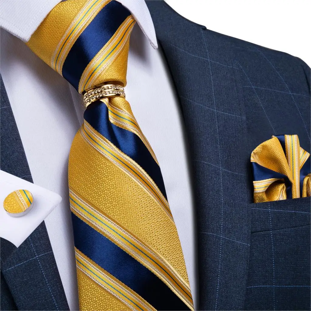 DiBanGu Mens Necktie Yellow Blue Striped Wedding Tie For Men New Design Necktie Ring Hanky Cufflinks Silk Tie Set Business Party