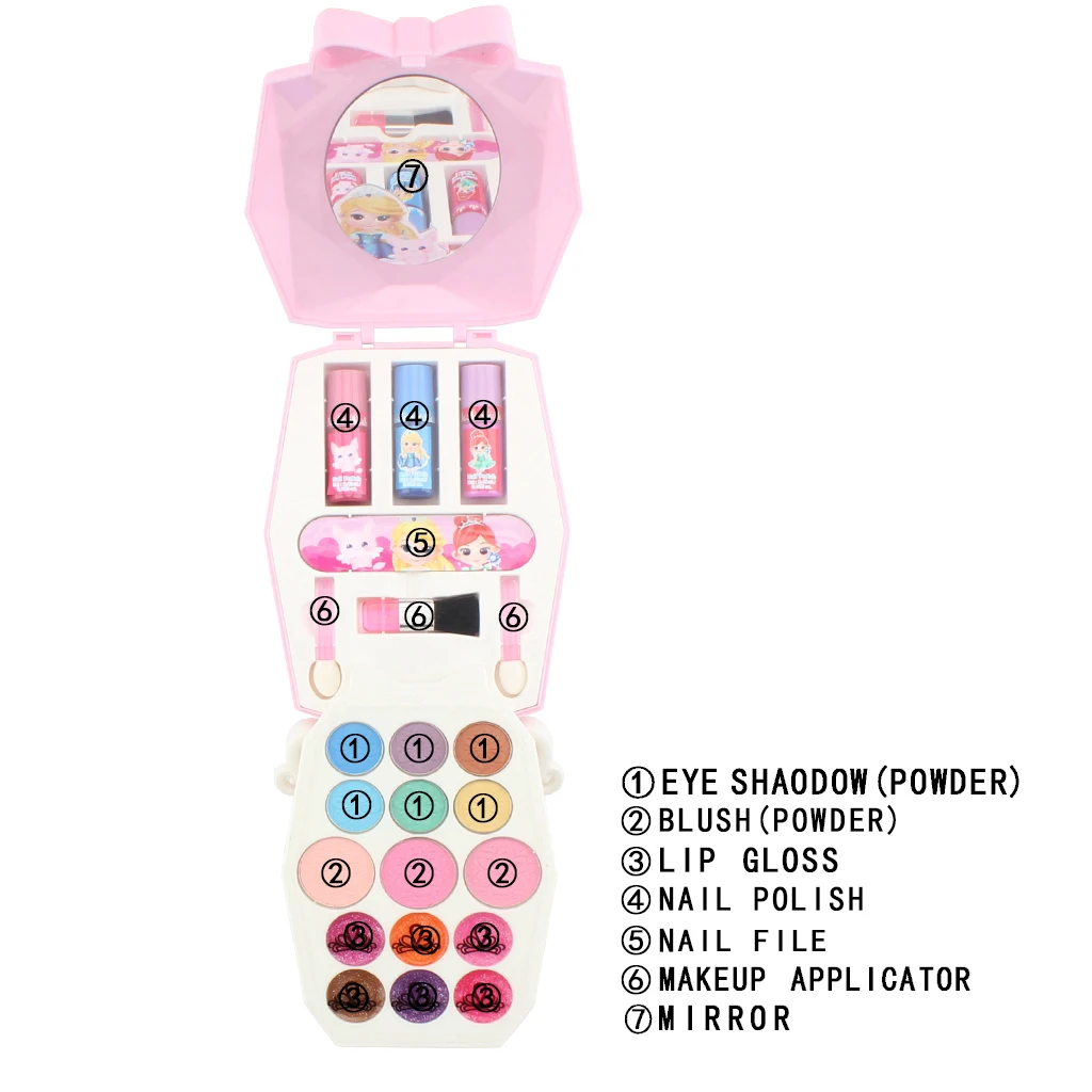 Включает в себя: 6-цветные тени для век, 3 лака для ногтей, 6-цветный блеск для губ, 3 цвета румян, 3 кисти, 1 пилочка для ногтей