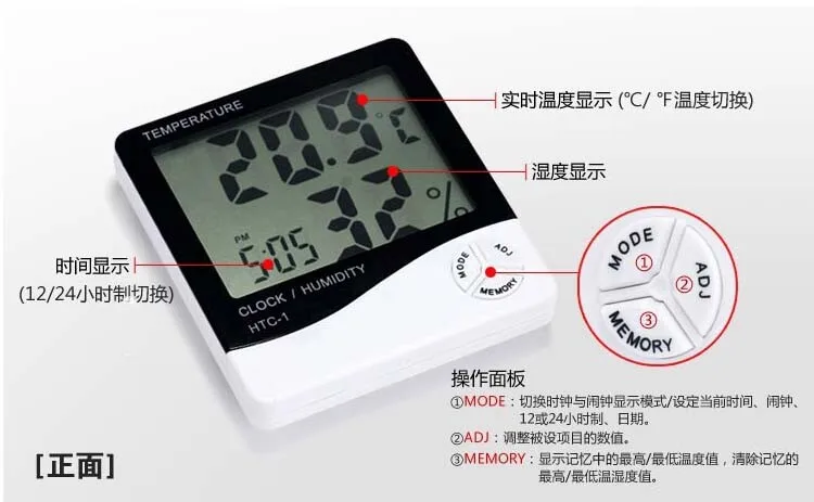 1. Температура и влажность функции: с диапазоном температур от-10 °C до + 50 °C и влажности 10% ∼ 99% RH, температура и влажность показания показать напрямую