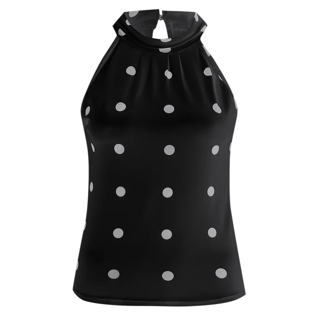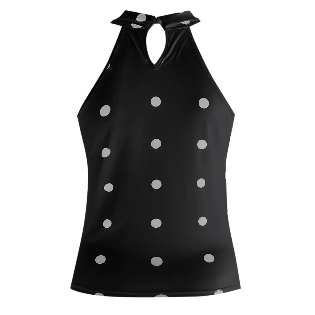 3. Круглый вырез,Без рукавов,Застежка без застежки, узор в горошек, вырез-капелька сзади. Простой, но модный. Стройной и подтянутой. Повседневный летний топ с лямкой на шее.