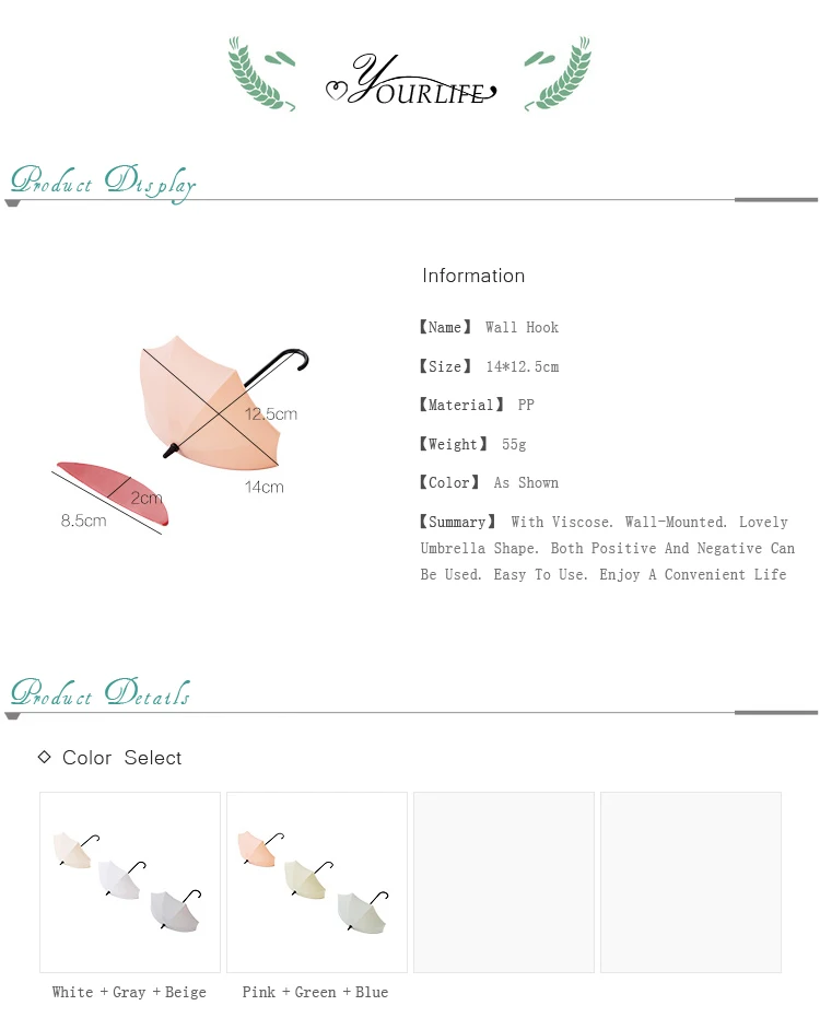 Особенности: 100% новый товар высокого качества. Креативный Дизайн зонта, прекрасный и красивый. Самоклеющаяся конструкция, они не повредят ваши стены. В ванной комнате, вы можете держатель ювелирных изделий, часов, мячей для ванны и т. Д. На кухне можно повесить полотенце, почистить шарик, помыть ткань и т. Д. Технические характеристики изделия: Материал: PP Размеры: 14*12,5 см Цвет: как показано на рисунке Вес: 55 г -Примечание: 1. Размер для ручного измерения, может быть погрешность от 0 до 1 см, это нормальное явление. 2. В связи с разной конфигурацией разных мониторов изображение не отображает фактический цвет товара. Если у вас есть какие-либо другие пожелания, пожалуйста, оставьте нам сообщение, чтобы мы постарались помочь вам.