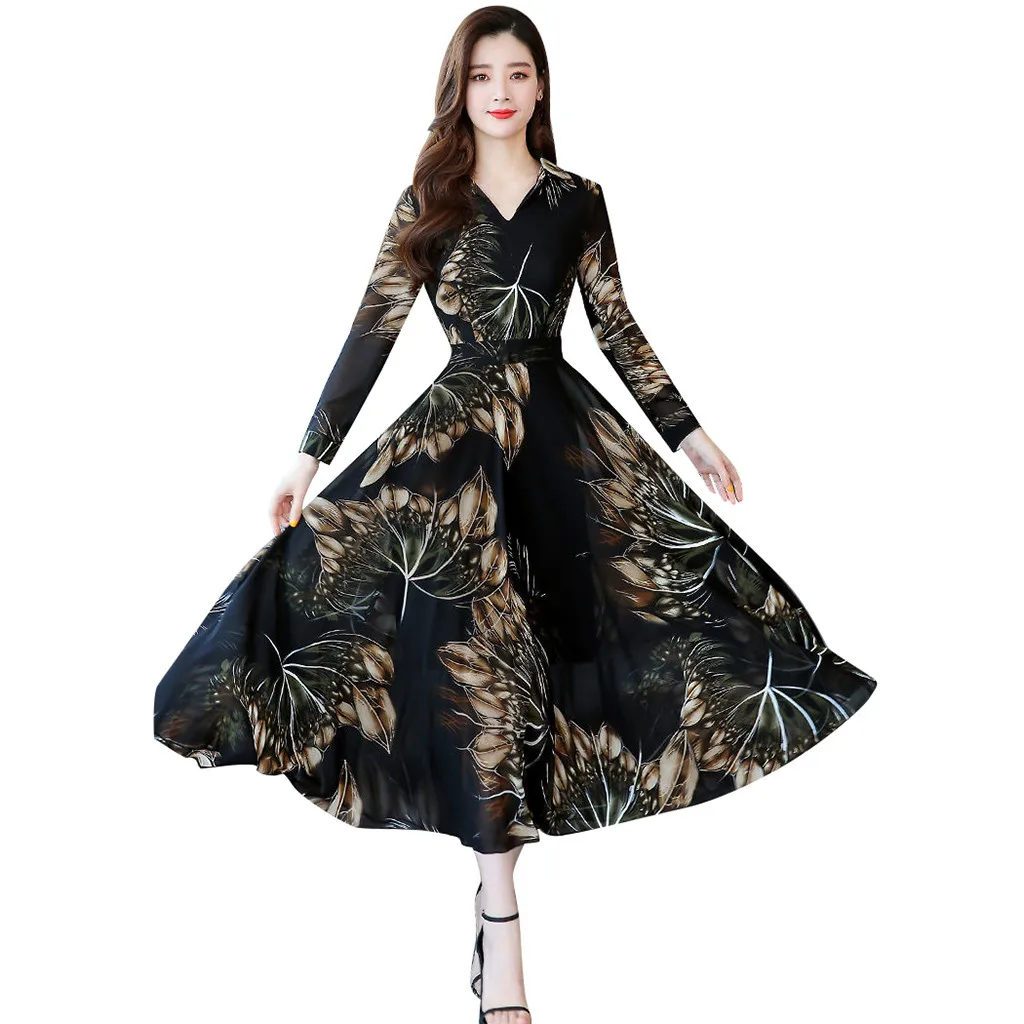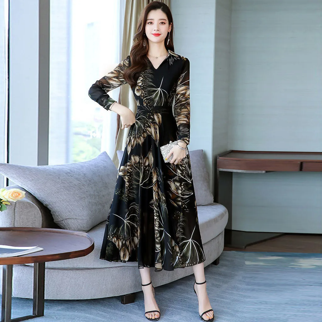 Особенности: винтаж, принт, v-образный вырез, длинный рукав, макси-платье, длинное платье, винтажный стиль, платье с запахом, Осеннее и весеннее платье.