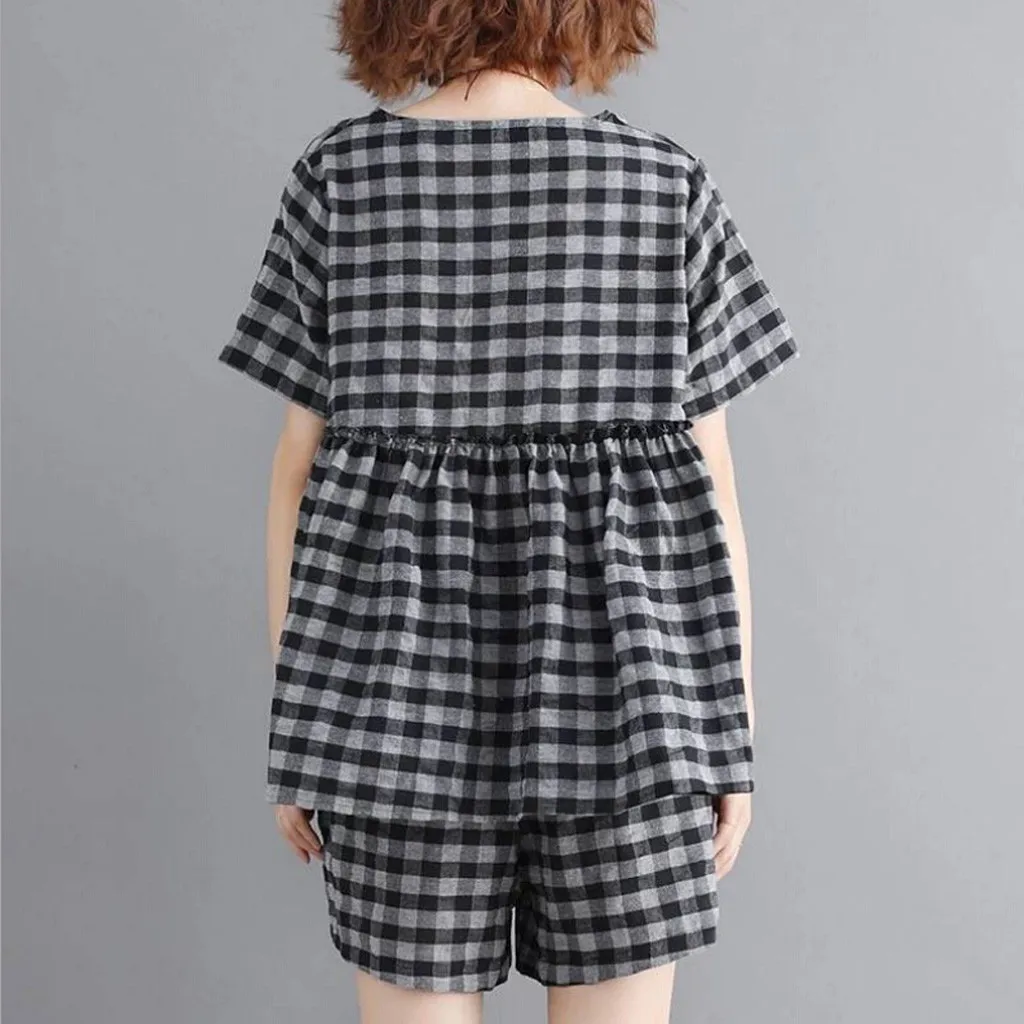 2pcs Fashion Women O-Neck Short Sleeve Short pant Suit Plaid Tops+Pants SetFeatures: