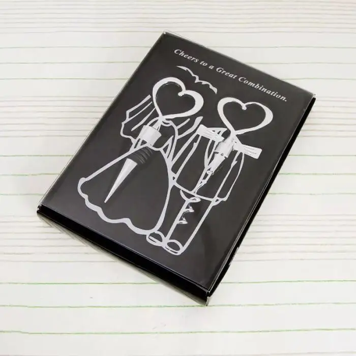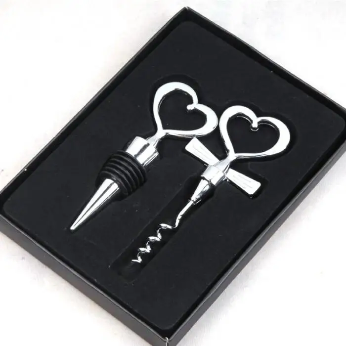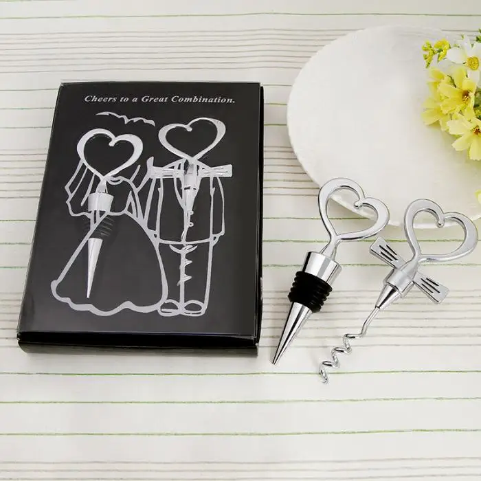 2.Эта хромированная пробка для вина с наконечником в виде сердца и штопор для невесты и жениха-забавная и умная вещь. В каждый набор входит хромированная бутылка с открытым сердцем и штопор.