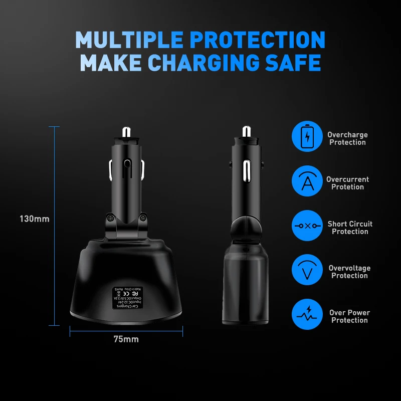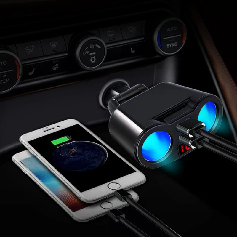 -Двойной USB, интеллектуальная Быстрая зарядка может увеличить скорость зарядки 60% и сэкономить время зарядки 40%. -Двойные порты прикуривателя, удобные для пользователей для одновременной зарядки различных устройств. -Интеллектуальный чип может эффективно контролировать температуру, чтобы избежать высокой температуры. -Есть экран для отображения напряжения аккумулятора автомобиля, защищающий ваше безопасное вождение. -Автомобильное зарядное устройство может поворачиваться в диапазоне 110 градусов в соответствии с вашими потребностями. -Совместимость с большинством транспортных средств, включая автомобиль, грузовик, внедорожные транспортные средства и так далее.