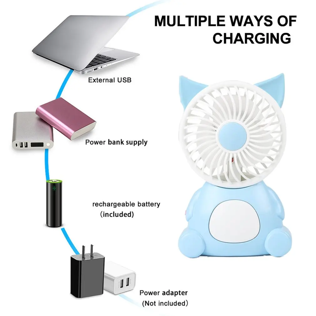 Источник энергии: этот вентилятор является перезаряжаемой моделью с usb-портом. Он также может питаться непосредственно от батареек, но вы должны удалить изоляцию из батарейного отсека, иначе он не будет заряжен или использоваться. usb-кабель можно заряжать с помощью компьютера, мобильного питания, банка питания и так далее.