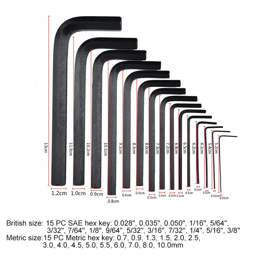 Метрический Размер: 15 шт метрический шестигранный ключ: 0,7, 0,9, 1,3, 1,5, 2,0, 2,5, 3,0, 4,0, 4,5, 5,0, 5,5, 6,0, 7,0, 8,0, 10,0 мм