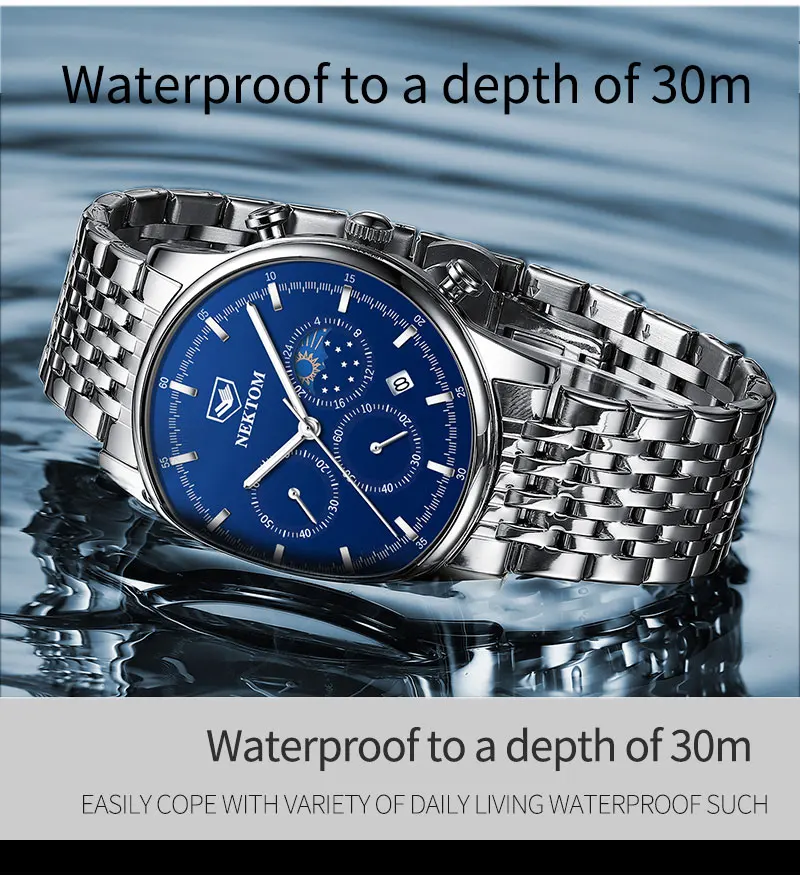 -3 АТМ/30 м водонепроницаемый (поддерживает душ в холодной воде и плавание, не работает с часами под водой, не поддерживает горячую воду);