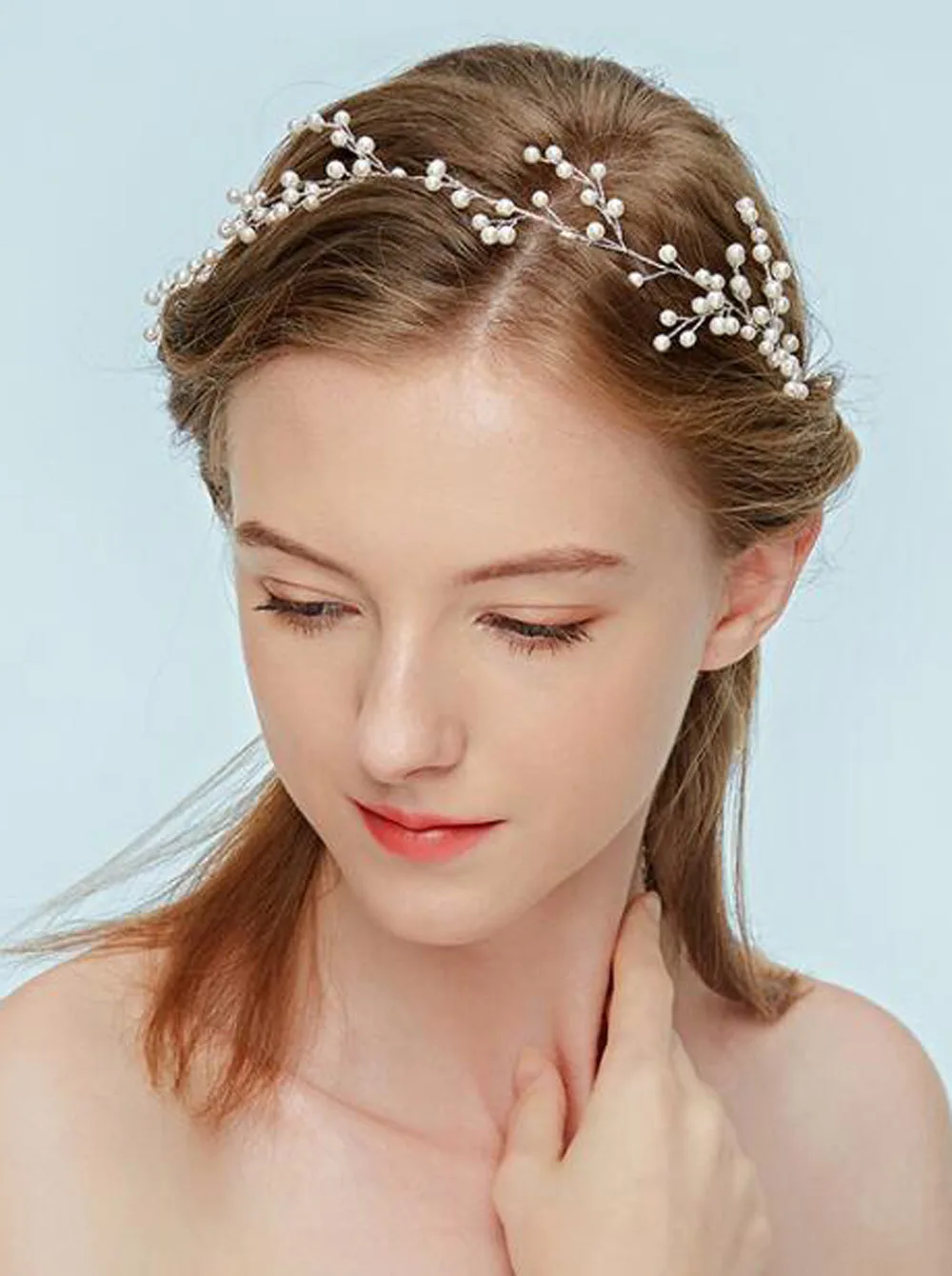 Материал: искусственный жемчуг Этот предмет очень универсален и можно носить во многих прическах из повязки на голову, задника или вплетать в хвостики и косички. Украшены металлическими листьями и блестящими стразами. Провод гибкий и простой в форме. Его можно носить с лентами или без, на каждом конце есть небольшая проволочная петля, а также, если вы хотите также закрепить ее.