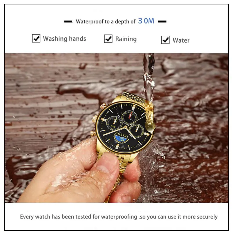 -3 АТМ/30 м водонепроницаемый (поддерживает душ в холодной воде и плавание, не работает с часами под водой, не поддерживает горячую воду);