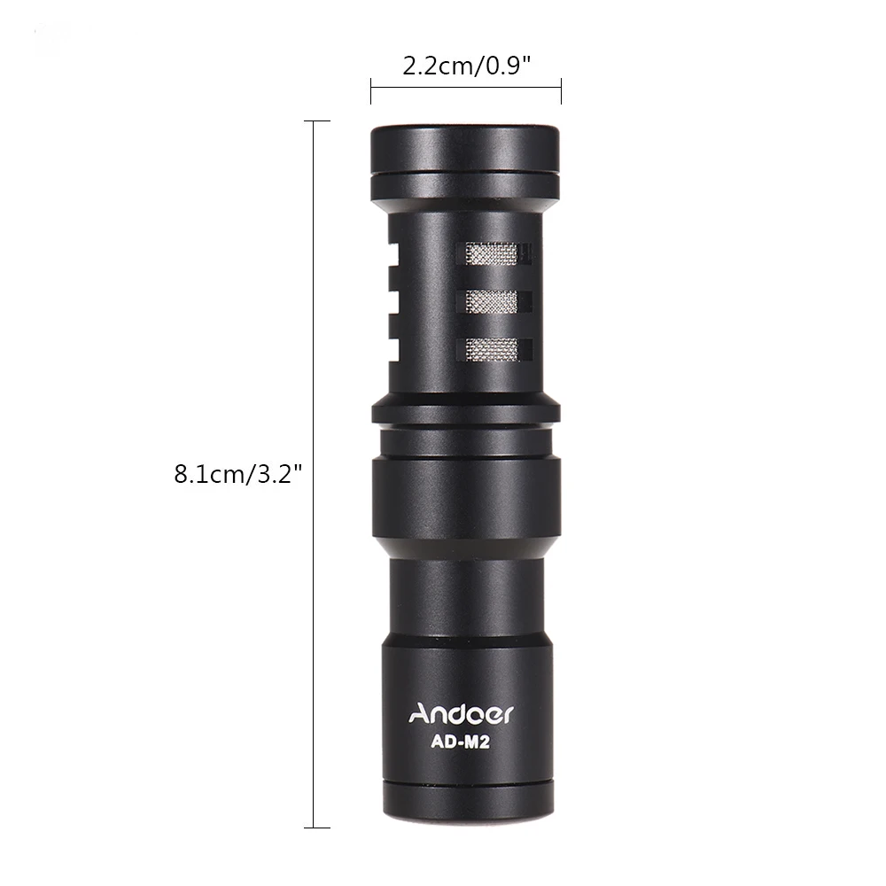 Andoer AD-M2 частотная характеристика микрофона: 35-18 кГц ± 3 дБ; Чувствительность: -42 дБ ± 1 дБ/0 дБ = 1 В/па, 1 кГц; Отношение сигнал-шум: 74 дБ SPL.