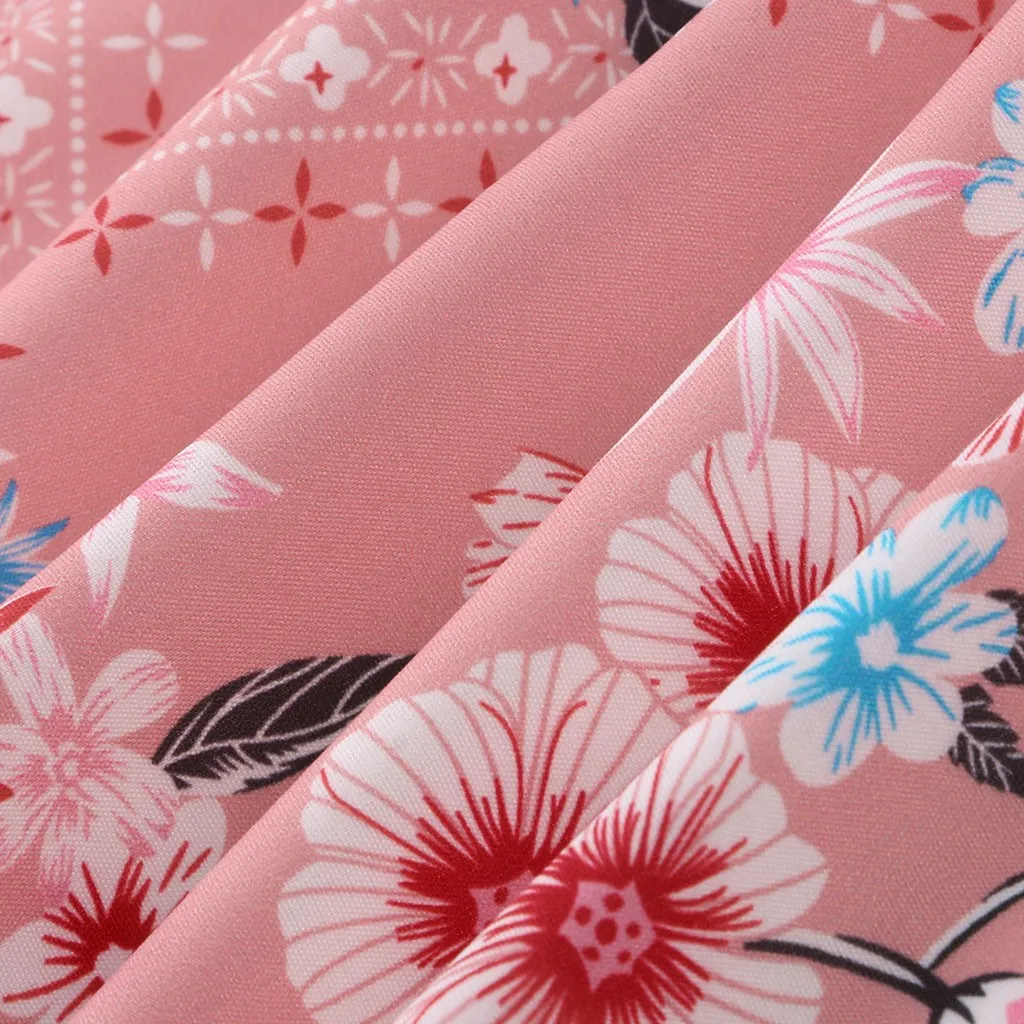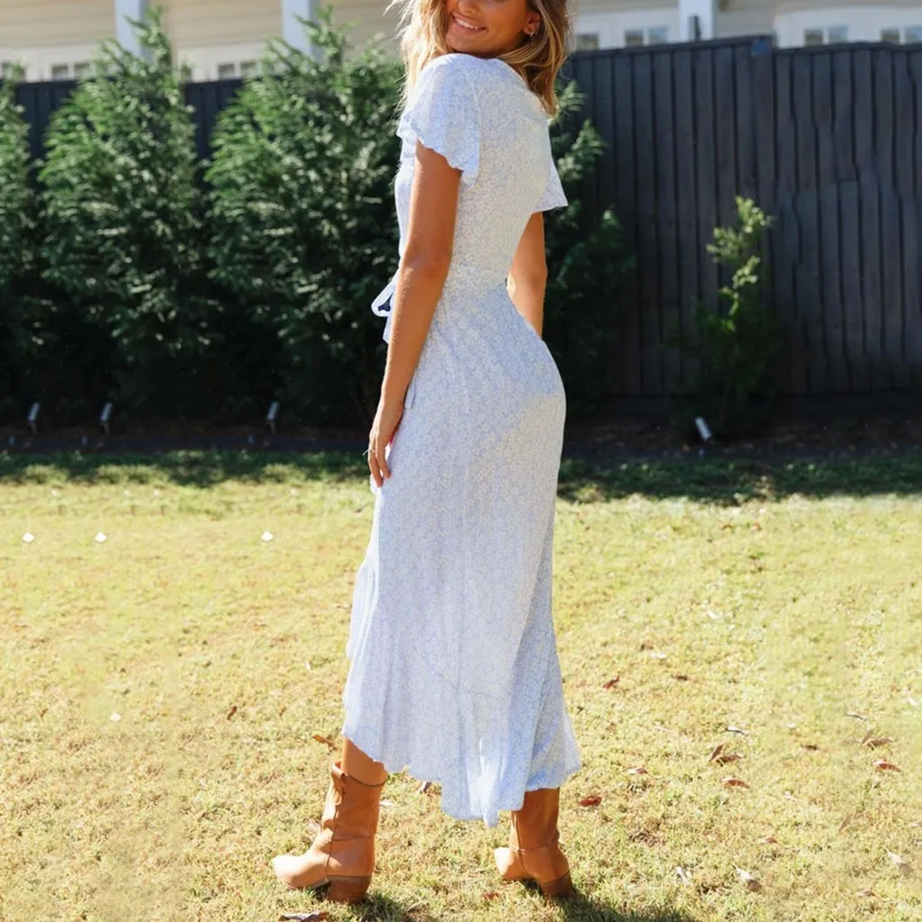 Повседневное платье с богемным принтом, v-образным вырезом и коротким рукавом, украшенное модным дизайном. Легкая и неэластичная ткань. Свободный силуэт.
