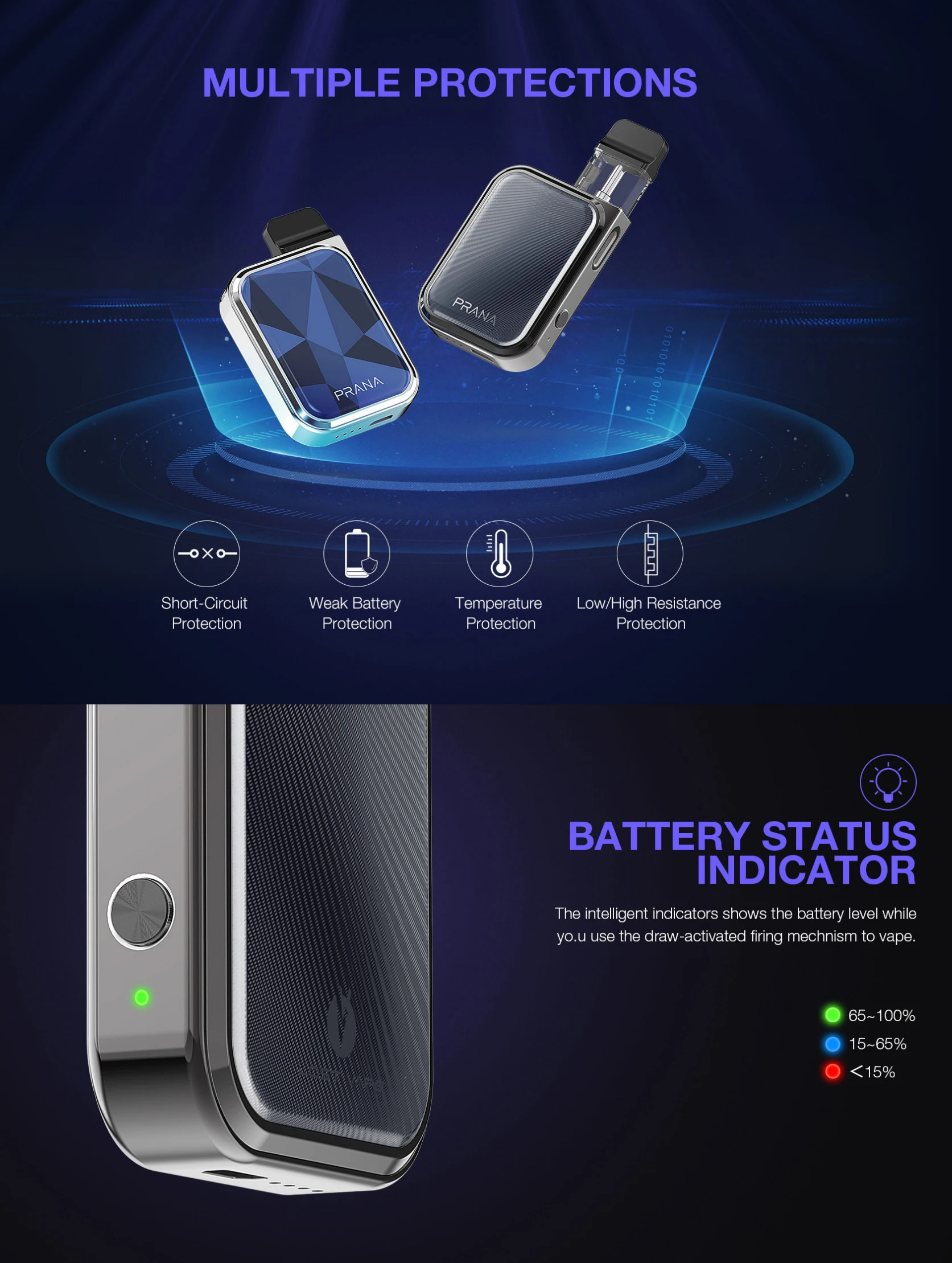 1. 3 регулируемых уровня мощности: 9 Вт, 10 Вт, 12 Вт 2. Дробление, активированное стрелками 3. Поставляется с блестящей импортной акриловой и текстурированной кожей, экологически чистой 4. Карманный размер 5. Легкая боковая заправка 6. Визуальное е-жидкое окно 7. Множественная защита: защита от короткого замыкания, слабая защита батареи, защита от температуры, защита от низкого/высокого сопротивления 8. Индикатор состояния батареи