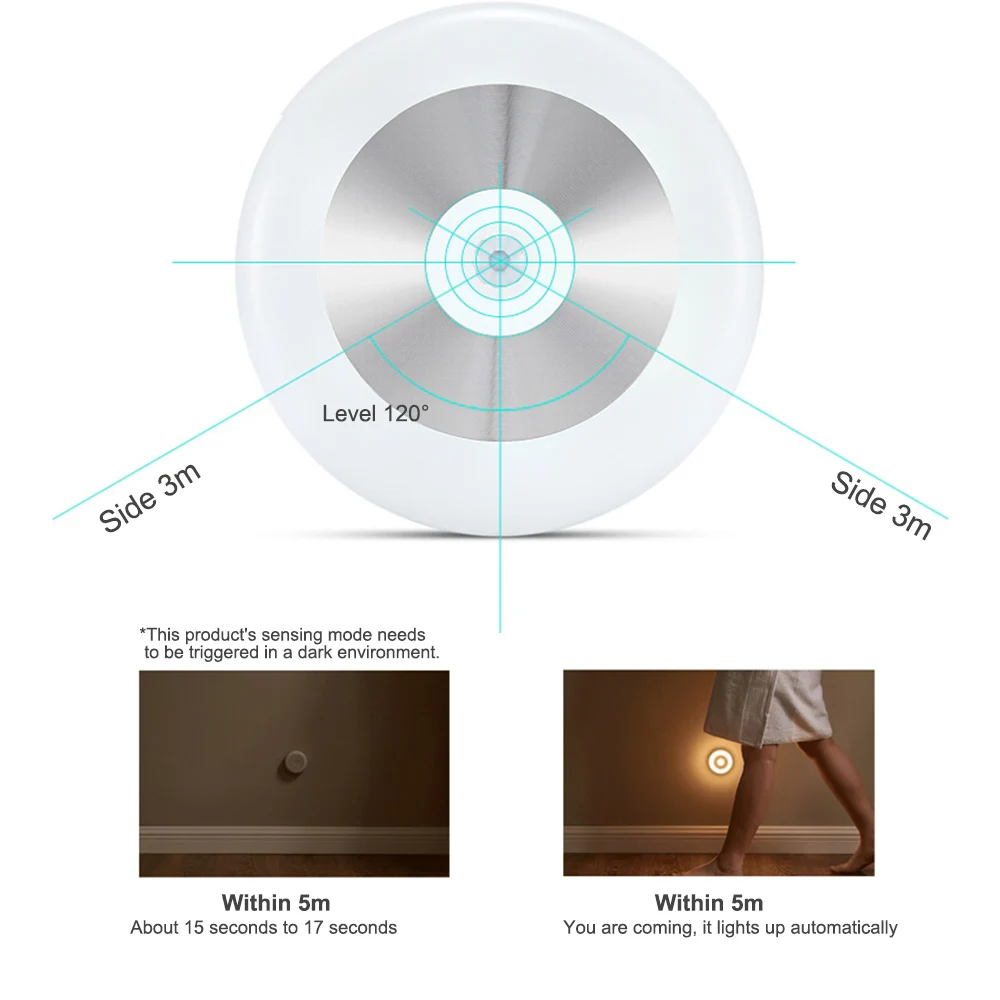Когда люди придут, они будут работать и выключаться, когда люди уйдут. Они имеют площадь датчика до 120 градусов, в пределах 5 метров спереди и в пределах 3 метров сбоку. Когда окружающая среда затемнена и ощущается, что кто-то проходит мимо, она автоматически загорается, что удобно и Энергосберегающе.