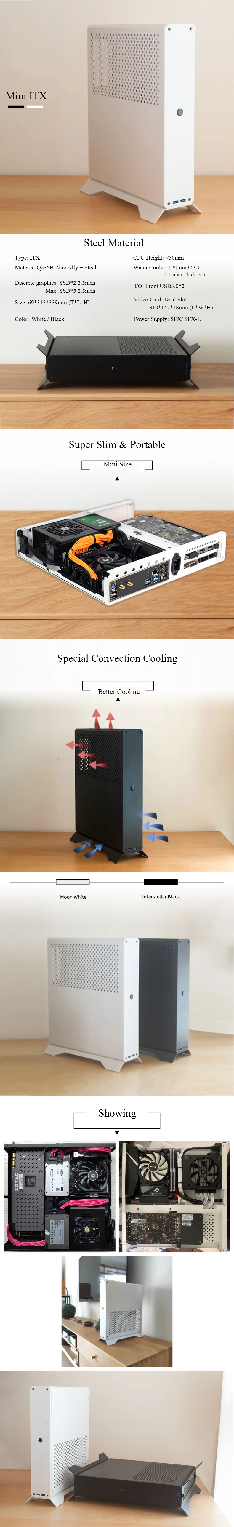 Важные Примечания для DIY: 1. Материнская плата Mini-ITX(Не входит в комплект) 2.Длина видеокарты <310 мм; Поддерживается 310*147*48 мм(Не входит в комплект) 3. Поддержка источника питания SFX и SFX-L(Не входит в комплект) 4. Высота охлаждения процессора <50 мм(Не входит в комплект)