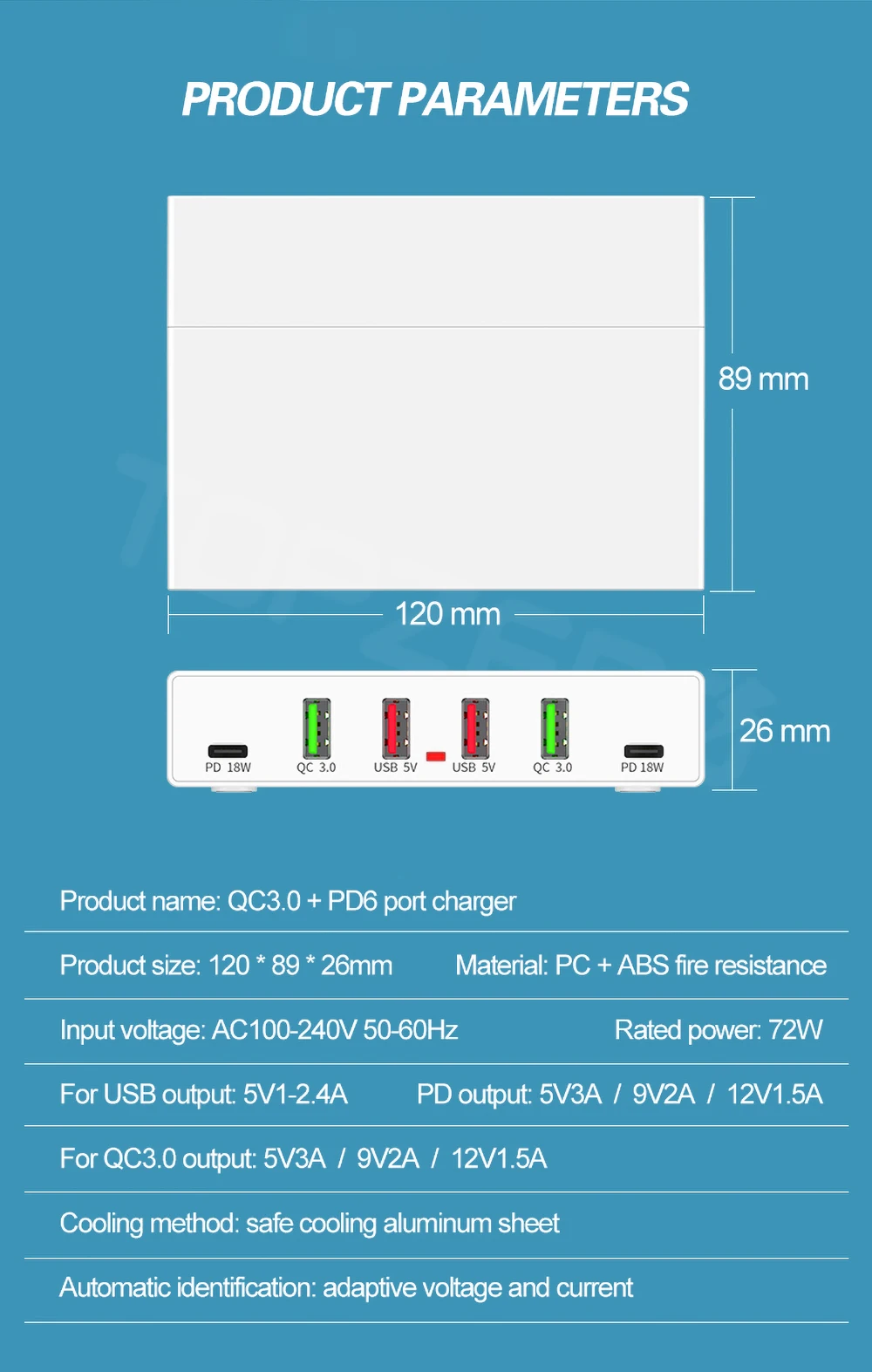 Название продукта: быстрое зарядное устройство QC3.0 PD3.0 на 6 портов мощностью 72 Вт