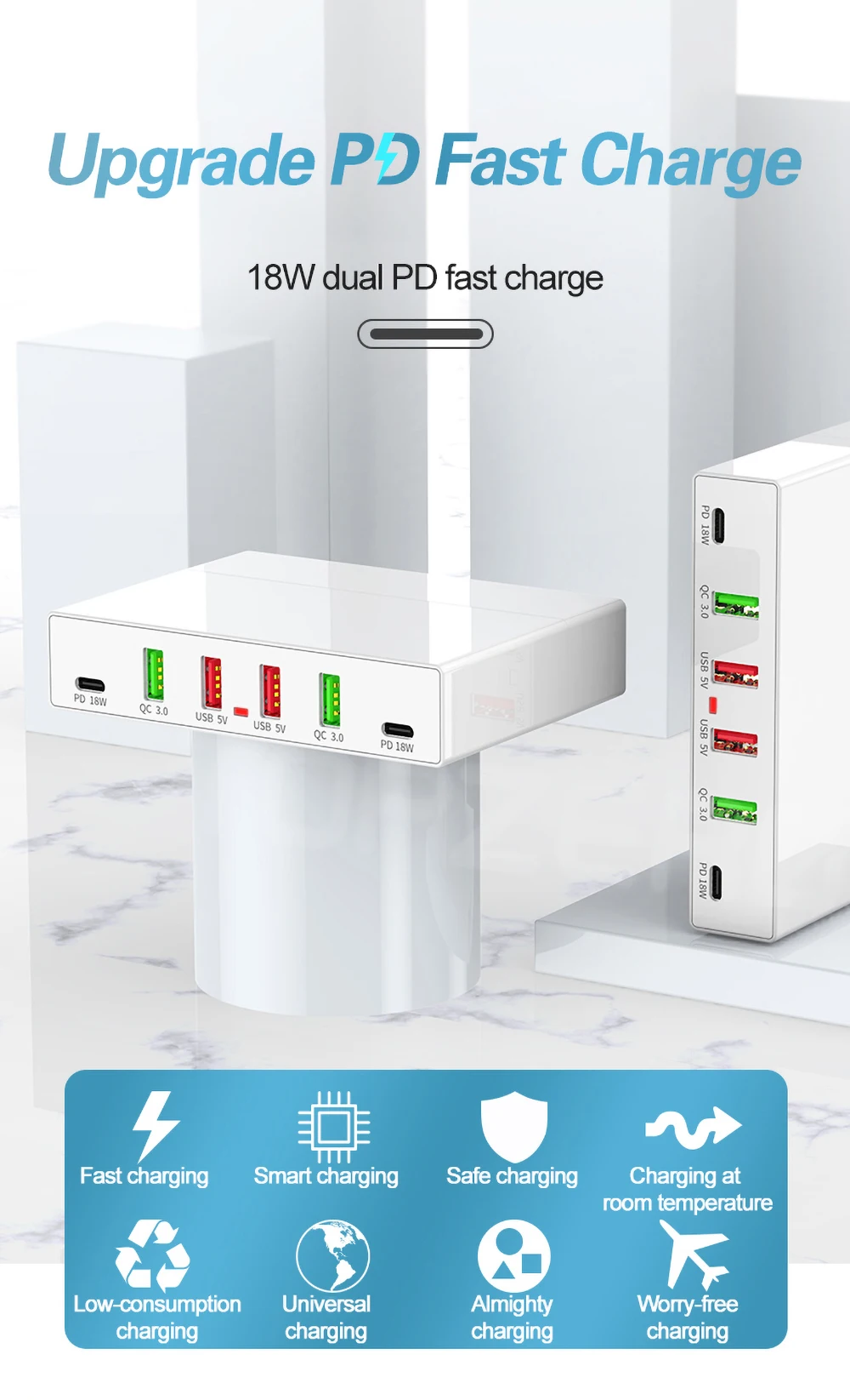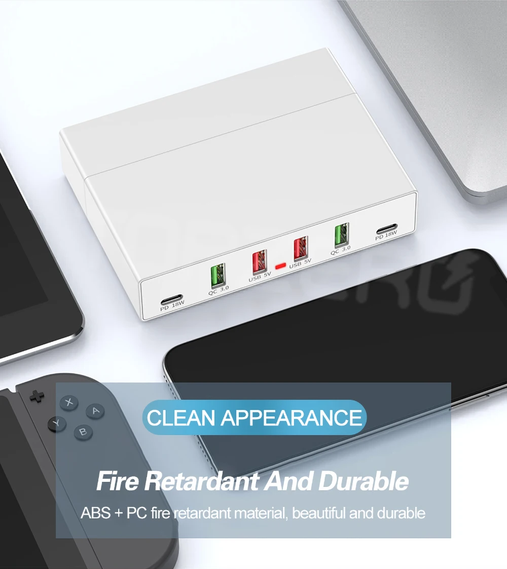1. Зарядное устройство на 6 портов, 2 порта для быстрой зарядки QC3.0, 2 порта для зарядки PD Type-c и 2 общих порта USB, позволяющие заряжать до 6 устройств одновременно.