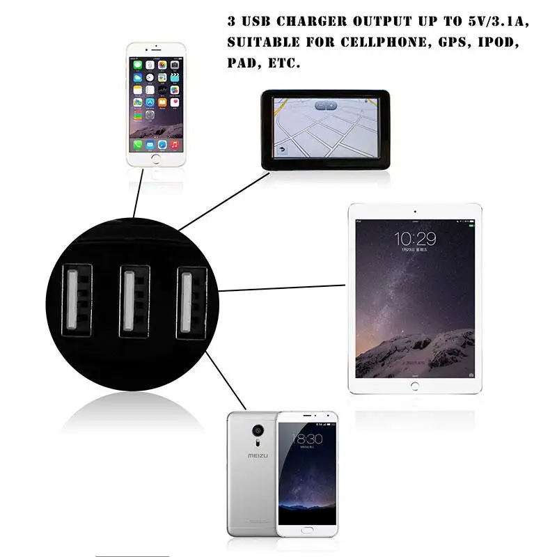 -Он имеет 6 портов, 3 порта для USB автомобильной зарядки с общей выходной мощностью 3,1 а для usb-устройств с входом 5 В, 3 гнезда для разветвителя прикуривателя.