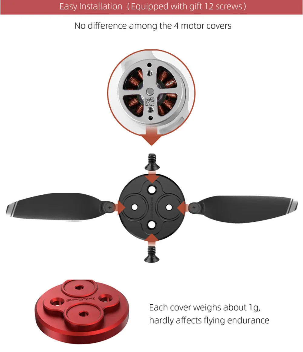 Чехол для двигателя Sunnylife Upgraed Мини-Дрон DJI MAVIC Пропеллеры блокируют дизайн: Эффективно предотвращают пропеллеры, царапины тела дрона Предотвратить пропеллеры царапины Дрон Эффективная защита Не нужно разбирать крышку при разборке пропеллеров все время защиты двигателя, точные винты крепления плотно прилегают к двигателям хорошее покрытие на двигателе Материал из алюминиевого сплава и отделка ЧПУ: светильник, прочный и устойчивый к царапинам Цвета: красный/черный Вес: 1 г/шт. Комплектация: 4 шт. красного или 4 шт. черного цвета Плотно прилегающие двигатели Удобное использование, один раз для всех, нет необходимости демонтировать крышки после завершения монтажаПосылка: