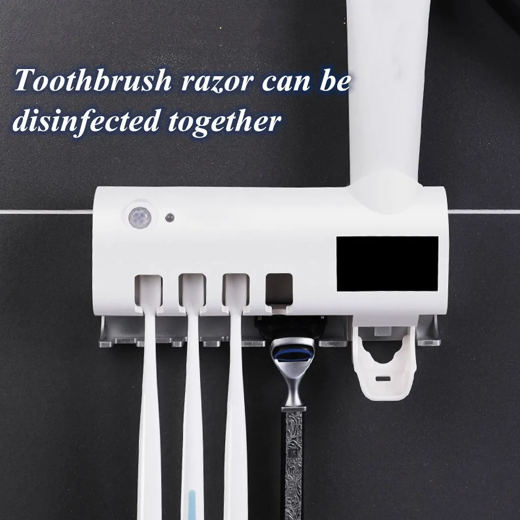 3-в-1: дозатор для зубной пасты, держатель для зубных щеток и дезинфицирующее средство для зубной щетки.