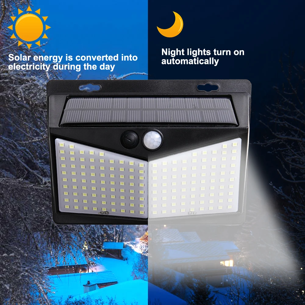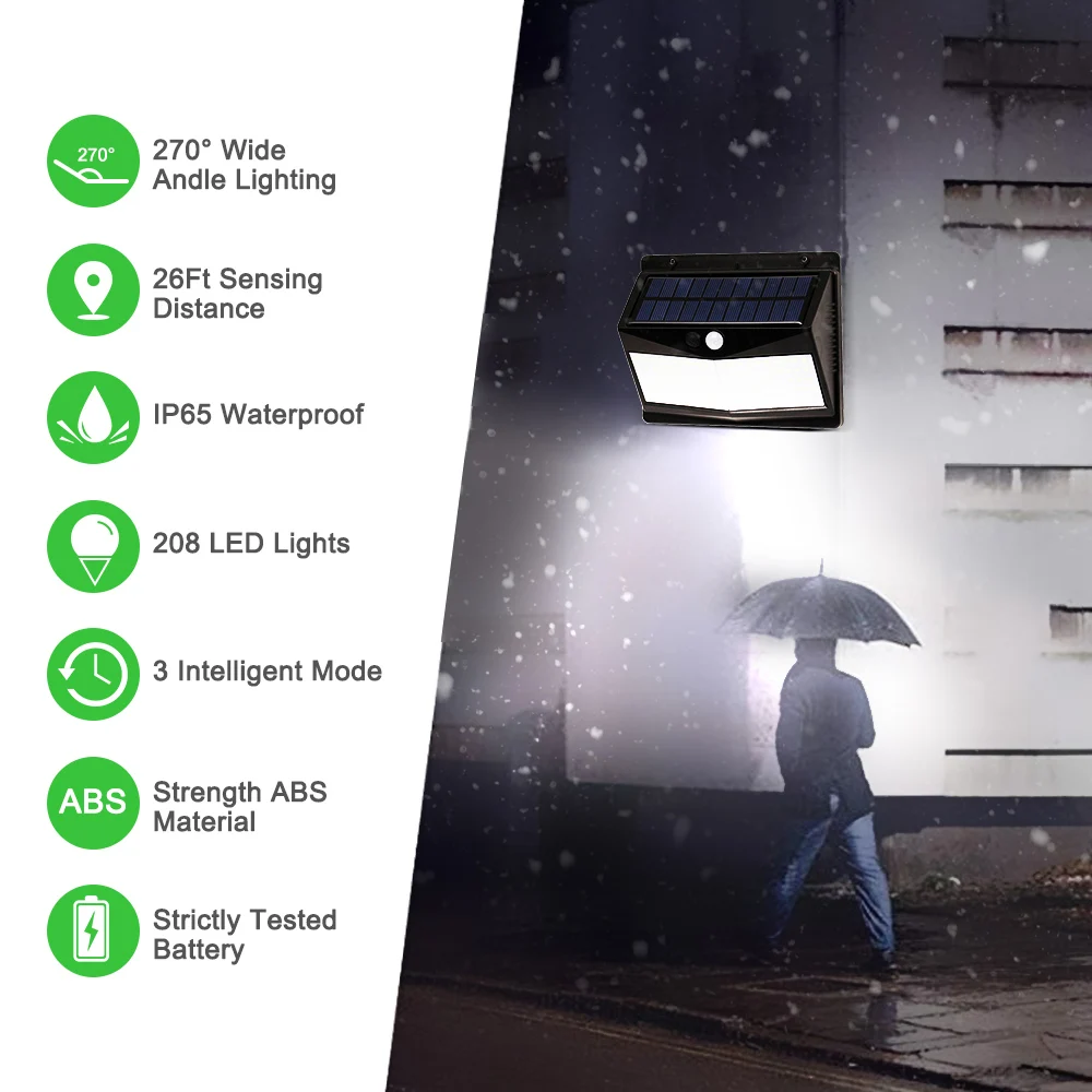 270 ° широкоугольное освещение: новейший 208 мощный светодиодный светильник на солнечных батареях для наружного освещения и 270 ° широкоугольное освещение, в то время как аналогичный продукт на рынке только имеет угол освещения 90 °. Мы обеспечиваем супер яркое освещение для более широкой области.