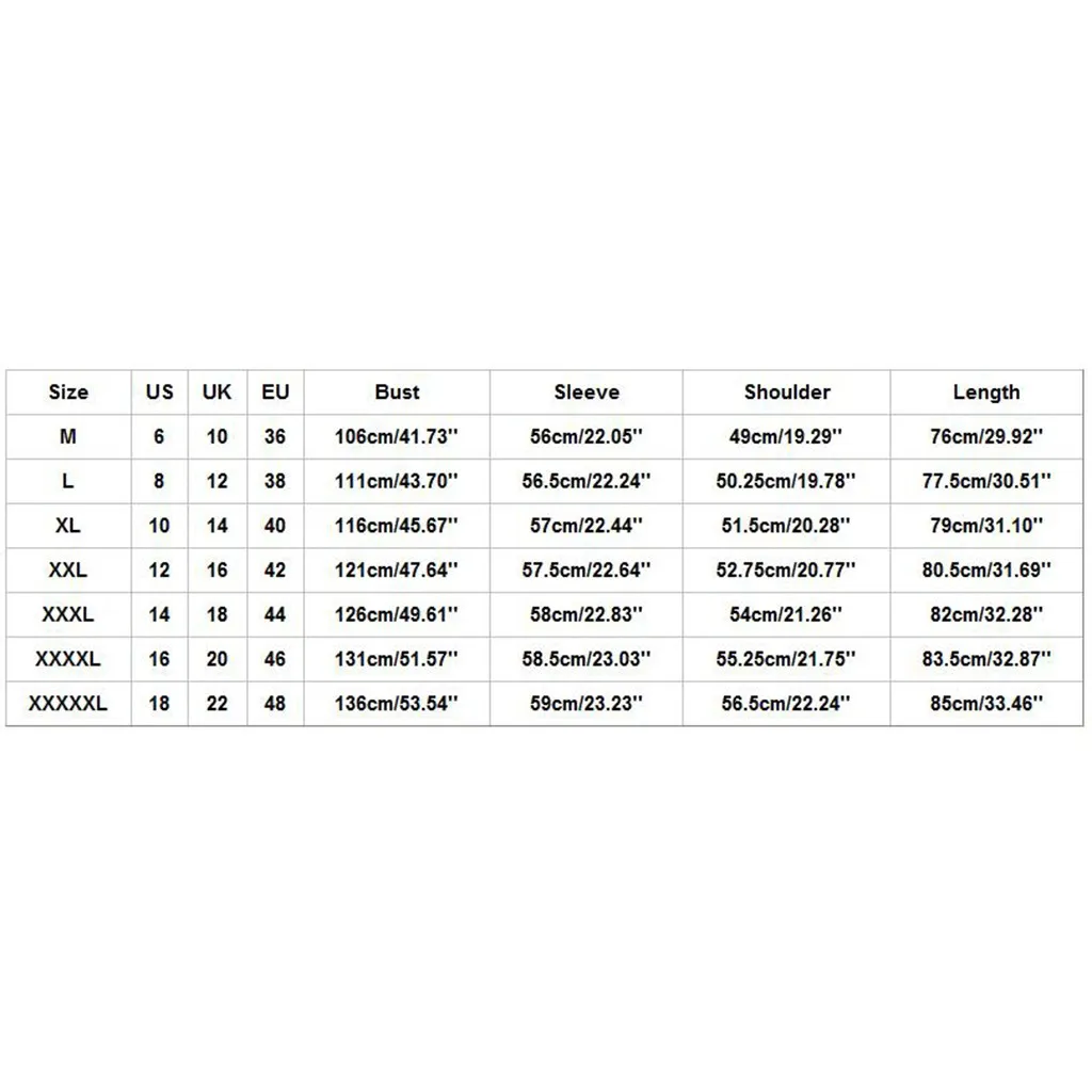 РазмерСШАВеликобританияЕСБюстРукавПлечоДлинаМ61036106 см/41,73''56 см/22,05''49 см/19,29''76 см/29,92''L81238111 см/43,70''56,5 см/22,24''50,25 см/19,78''77,5 см/30,51''XL101440116 см/45,67''57 см/22,44''51,5 см/20,28''79 см/31,10''XXL121642121 см/47,64''57,5 см/22,64''52,75 см/20,77''80,5 см/31,69''XXXL141844126 см/49,61''58 см/22,83''54 см/21,26''82 см/32,28''XXXXL162046131 см/51,57''58,5 см/23,03''55,25 см/21,75''83,5 см/32,87''XXXXXL182248136 см/53,54''59 см/23,23''56,5 см/22,24''85 см/33,46''