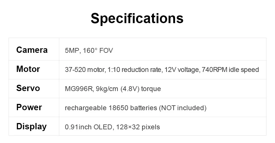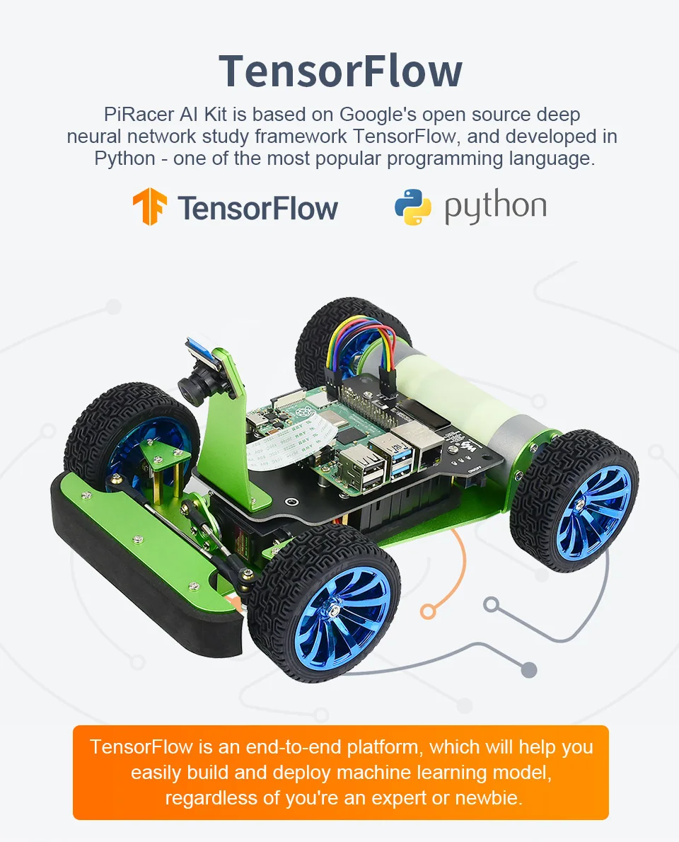 Аккумуляторы 18650 в комплект не входят Обратите внимание, что длина батареи должна быть менее 67 мм, некоторые аккумуляторы с защитной пластиной на рынке не поддерживаются,Узнать больше 1. ВариантыPI4B-4GB 2. ВариантыКарта Micro SD 16 Гб 3. Металлический комплект PiRacer 6 шт. 4. Войлок EVA 2 шт. 5. 3d-крышка двигателя 6. Плата расширения PiRacer 7. Камера RPi (G) 8. Акриловый элемент 9. Servo крепление 10. Металлический мотор-редуктор 2 шт. 11. Шины 4 шт. 12. Переходник 2 шт. 13. MG996R сервопривода 14. MG996R servo колесо 15. Повторного кулака, комплект из 2 предметов 16. Шарикоподшипник 4 шт. 17. M3 пластиковый шаровой шарнир 4 шт 18. Pull bar M3 2 шт. 19. 12,6 V зарядное устройство для батареи + ЕС головка 20. Беспроводной геймпад 21. 6Pin кабель 22. Гаечный ключ, комплект из 2 предметов 23. Отвёртки 2 шт. 24. Мини крестовой ключ с длинным рукавом 25 лет. Карта Micro SD кард-ридер 26. Набор винтов 27. Трек карта