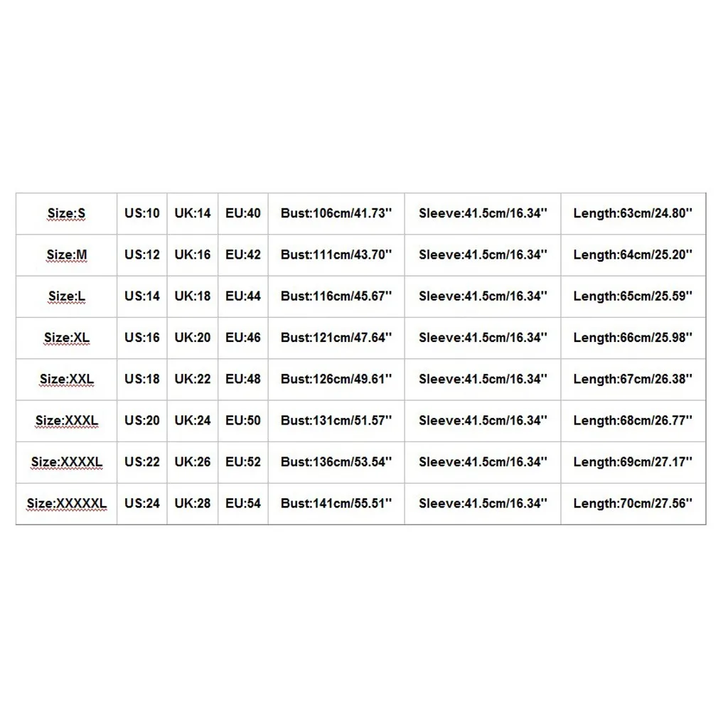 РазмерСШАВеликобританияЕСБюстРукавДлинаS101440106 см/41,73''41,5 см/16,34''63 см/24,80''М121642111 см/43,70''41,5 см/16,34''64 см/25,20''L141844116 см/45,67''41,5 см/16,34''65 см/25,59''XL162046121 см/47,64''41,5 см/16,34''66 см/25,98''XXL182248126 см/49,61''41,5 см/16,34''67 см/26,38''XXXL202450131 см/51,57''41,5 см/16,34''68 см/26,77''XXXXL222652136 см/53,54''41,5 см/16,34''69 см/27,17''XXXXXL242854141 см/55,51''41,5 см/16,34''70 см/27,56''
