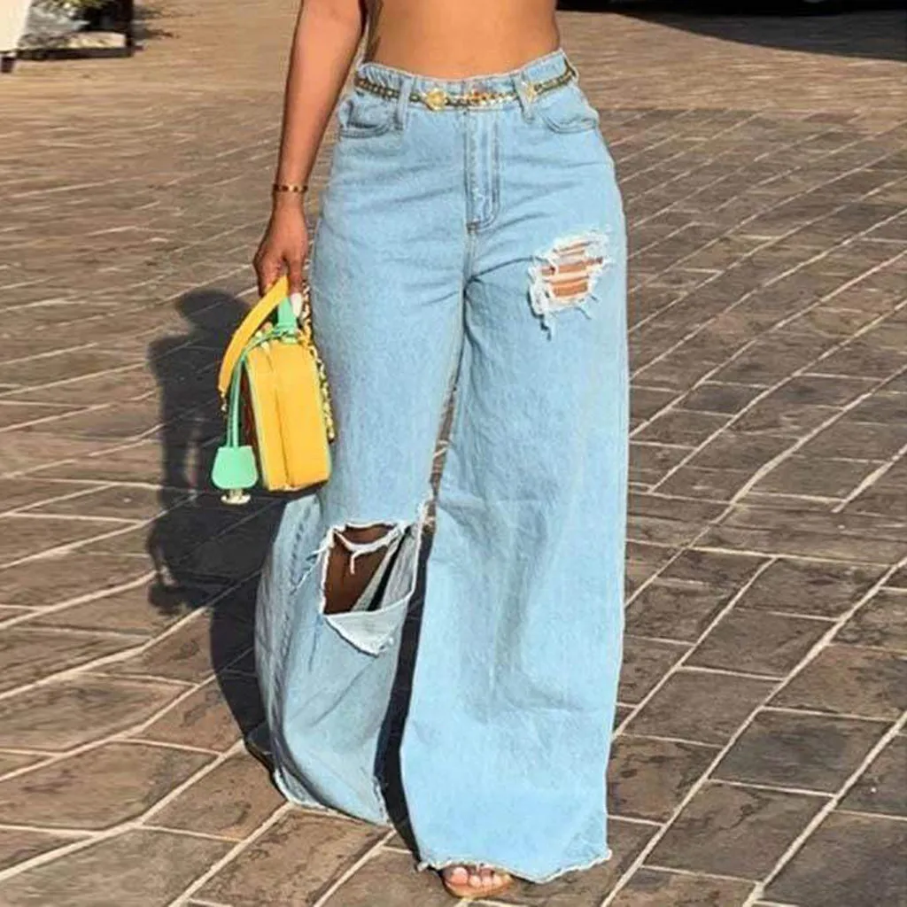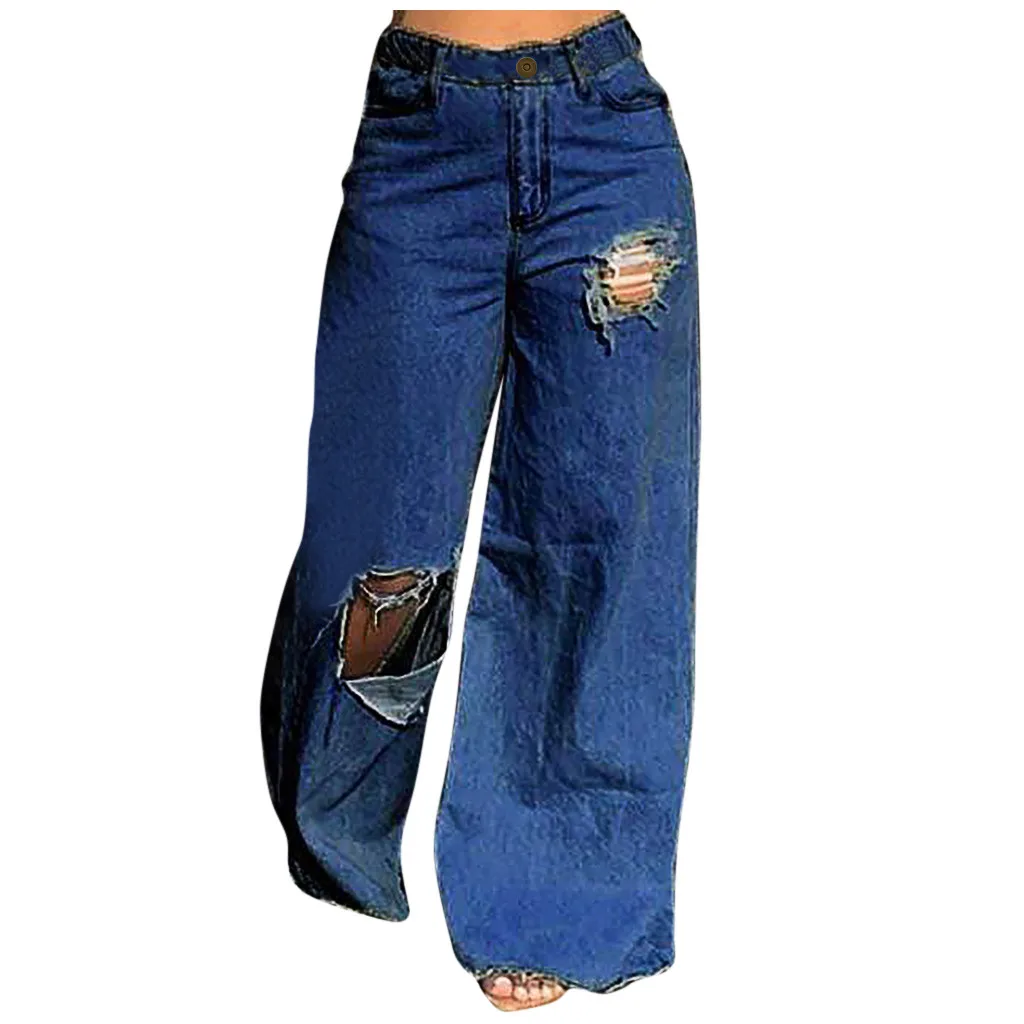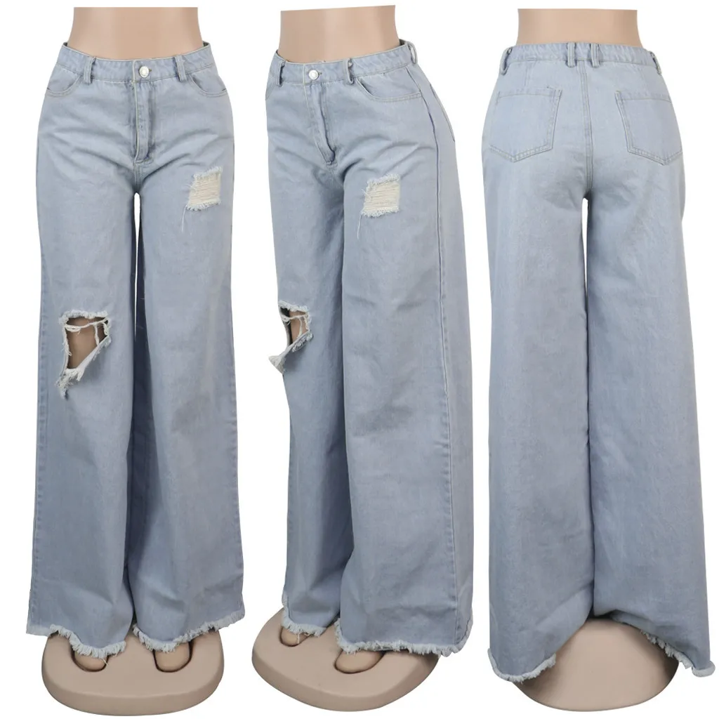 Весенние новые джинсы, модные женские свободные Асимметричные Длинные широкие брюки с дырками и высокой талией, брюки 2020, уличная одежда