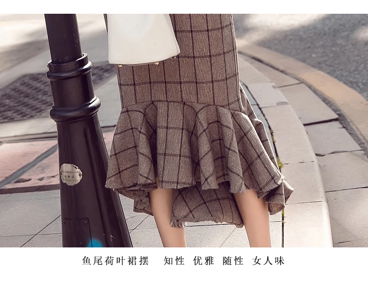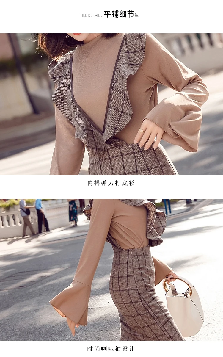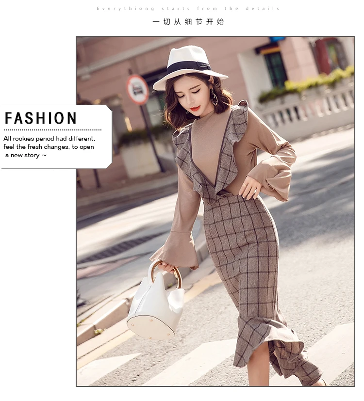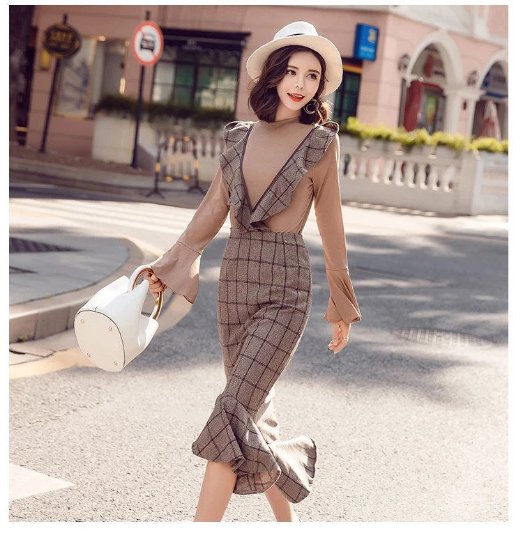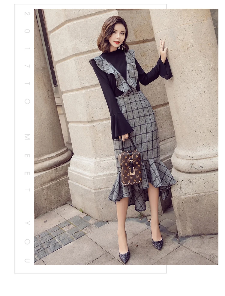 2020 Весна Высокое качество Новые Подиумные Женские топы с расклешенными рукавами + Женский комплект 2 шт. клетчатое платье с рыбьим хвостом DC843 <
