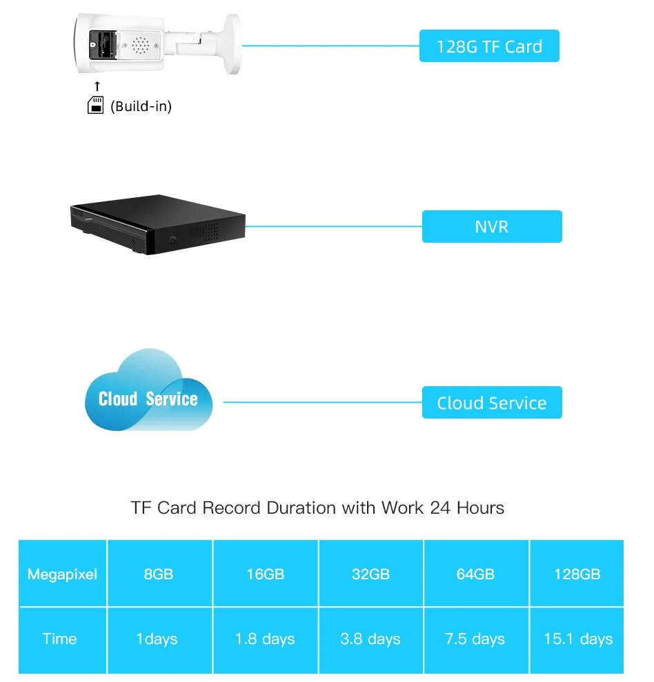 Sd-карта и облако будут записывать, когда срабатывает Обнаружение движения. Камера поддерживает предварительный запись (3 s-6 s) и пост-запись. Когда sd-карта заполнена, она автоматически закроет старое видео. И Облачное хранилище более удобно, все записи будут загружаться в облако автоматически, и вы можете загружать записи в любое время в любом месте.