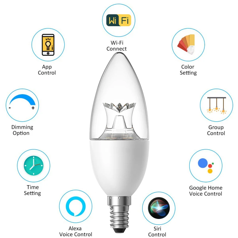 Совместим с Alexa Echo (через Smart Life), Echo dot и Google Home Assistant, Управляйте лампочкой wifi через ваш голос, не требуется концентратор. (e.g. "Alexa, установите спальню для чистки")