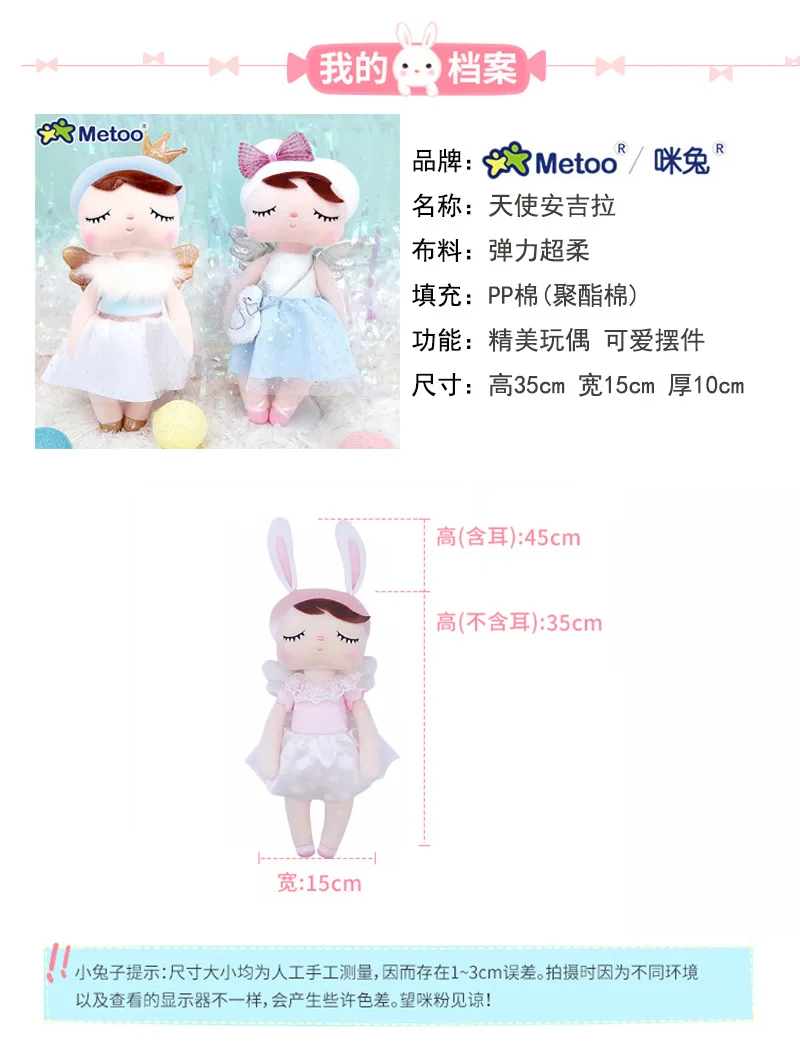 Название: Плюшевая Кукла ангела мету Анжела Возраст: дети и взрослые старше 3 лет Материал: короткая плюшевая/кружевная юбка Материал наполнителя: 100% качественный полипропиленовый хлопок Цвет: 5 цветов Размер: 33-43 см содержит ухо Вес: 0,15 кг Посылка: OPP сумки