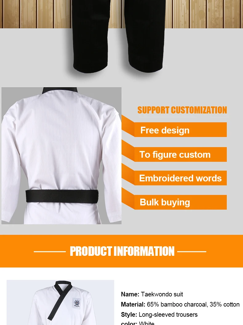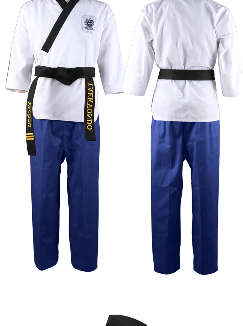 1. Тип одежды: WTF тхэквондо добок 2. Размер: 110 см-190 см 3. Цвет: белая куртка, темно-синий, красный, черные брюки 4. Материал: хлопок/полиэстер 5. WTF Стандарт 6. Упаковка включает: 1 брюки + 1 куртка (без ремня)
