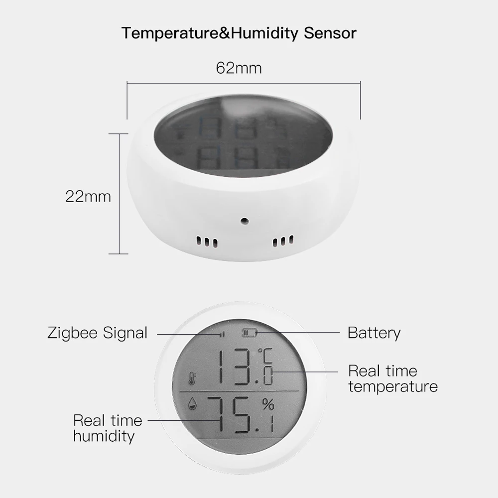 Особенности 1. Стандартный протокол Zigbee, беспроводная пара к концентратору ZigBee. 2. Простой и модный дизайн с питанием от аккумулятора с наклейкой и поддержкой легко положить его в любое место 3. Работает с Tuya Zigbee Hub для домашней системы автоматизации, отображения температуры и влажности в реальном времени и связи, работает с настройками автоматизации, питается от Tuya 4. Совместимость с ewelink zigbee hub
