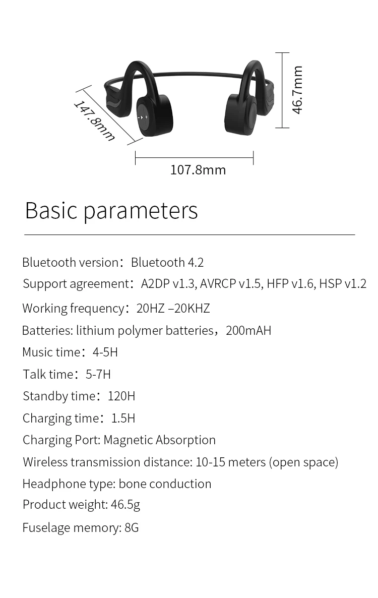 1. Отличное изобретение, одно проводящее наушники предназначены для передачи звука через вибрации человеческого уха и обоих ушек, помогая людям с потерей слуха. 2. Удобные и безопасные: наушники с проводимостью костей и беспроводным подключением Bluetooth4.2, вы можете слушать музыку и отвечать на телефон, не подключая ушной канал в приемник, и ваши уши могут слышать окружающий звук, очень безопасно. 3. Использование сцены: наушники с костной проводимостью, сильное сопротивление поту, подходит для бега, велоспорта, фитнеса, альпинизма, скалолазания и вождения. 4. Поставляется с картой памяти 8 Гб, может хранить музыку 2000. 5. IPX8 профессиональный водонепроницаемый, 5 метров подводный глубина водонепроницаемый, дайвинг. 6. Зарядка 1-2 часа работы от батареи 6-8 часов, расстояние подключения составляет около 10 м/32,81ft.